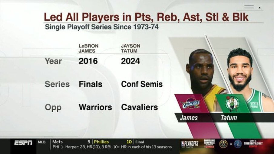 Last night, Tatum became the only player in NBA playoff history to have 25/10/9 with at least 3 3PM and only 1 TO. A performance that has only happened 5 times in all of NBA history. Unless your name is LeBron, Jokic, Isaiah Thomas (!!!), Latrell Sprewell and now Jayson Tatum, it's never happened.
