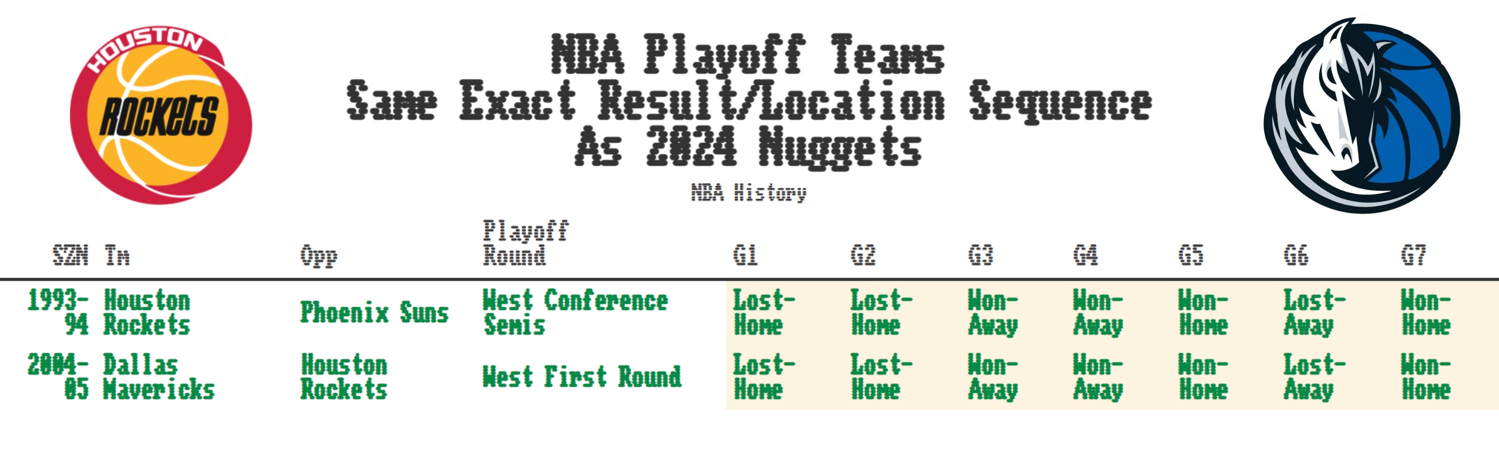 But the only two examples from this list that match the Nuggets result/location path through six games are the 1993-94 Rockets and 2004-05 Mavericks - both Game 7 winners.