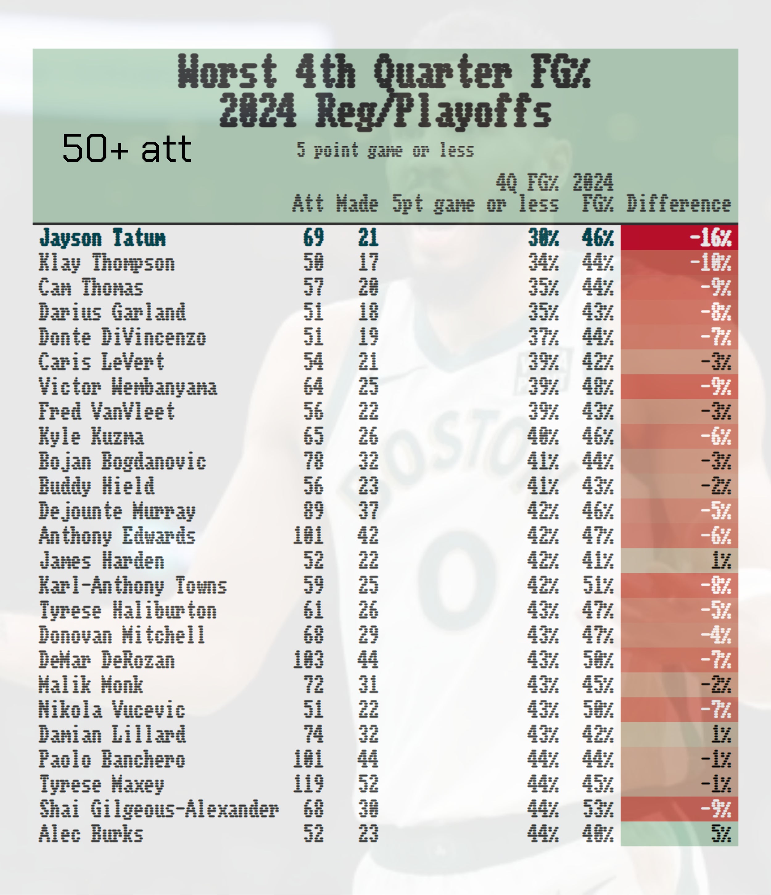 The list below shows the NBA's worst shooting percentages in the 4th quarter when the game is within five points one way or another (min 50 attempts). There's Jayson at the top which means he's the worst of the worst at a wilting 30%.