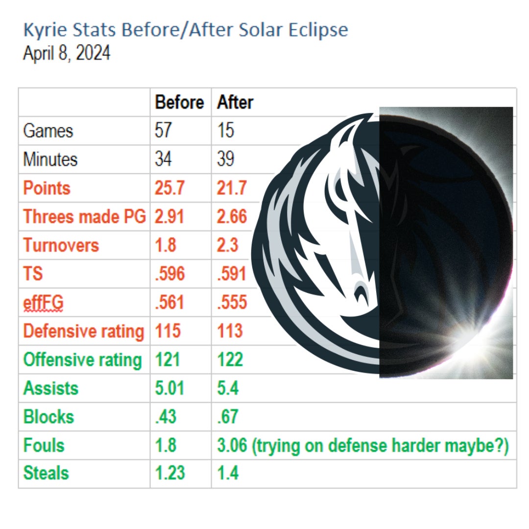 No excuses, but it took me until 3:17am last night/this morning to get to the Brian Windhorst interview on Wednseday's Pardon My Take while I fed my six month old son a bottle he ferociously drank as if he hadn't had one since 1:06am that very night. In the interview, Brian and the boys were wishing they could get the splits on Kyrie Irving's stats pre and post solar eclipse in which the path of totality was pretty much in Dallas. Theory being that Kyrie seems to have amped it up for the playoffs.