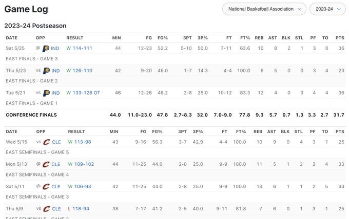 How does 30.1/9.9/6.1/1.7 on 46/32% with 2.4 3PM over his last 7 games (6-1) sound? Pretty good to me! In the ECF we've seen Tatum's efficiency start to come back (47.8%), and while I don't think he's going to shoot 5-10 every night from three like he did last night, if that's a sign that he can live in the mid to high 30s the rest of the way, well I'm not sure how you guard him considering nobody can guard him at this point and he's not even making his 3s.