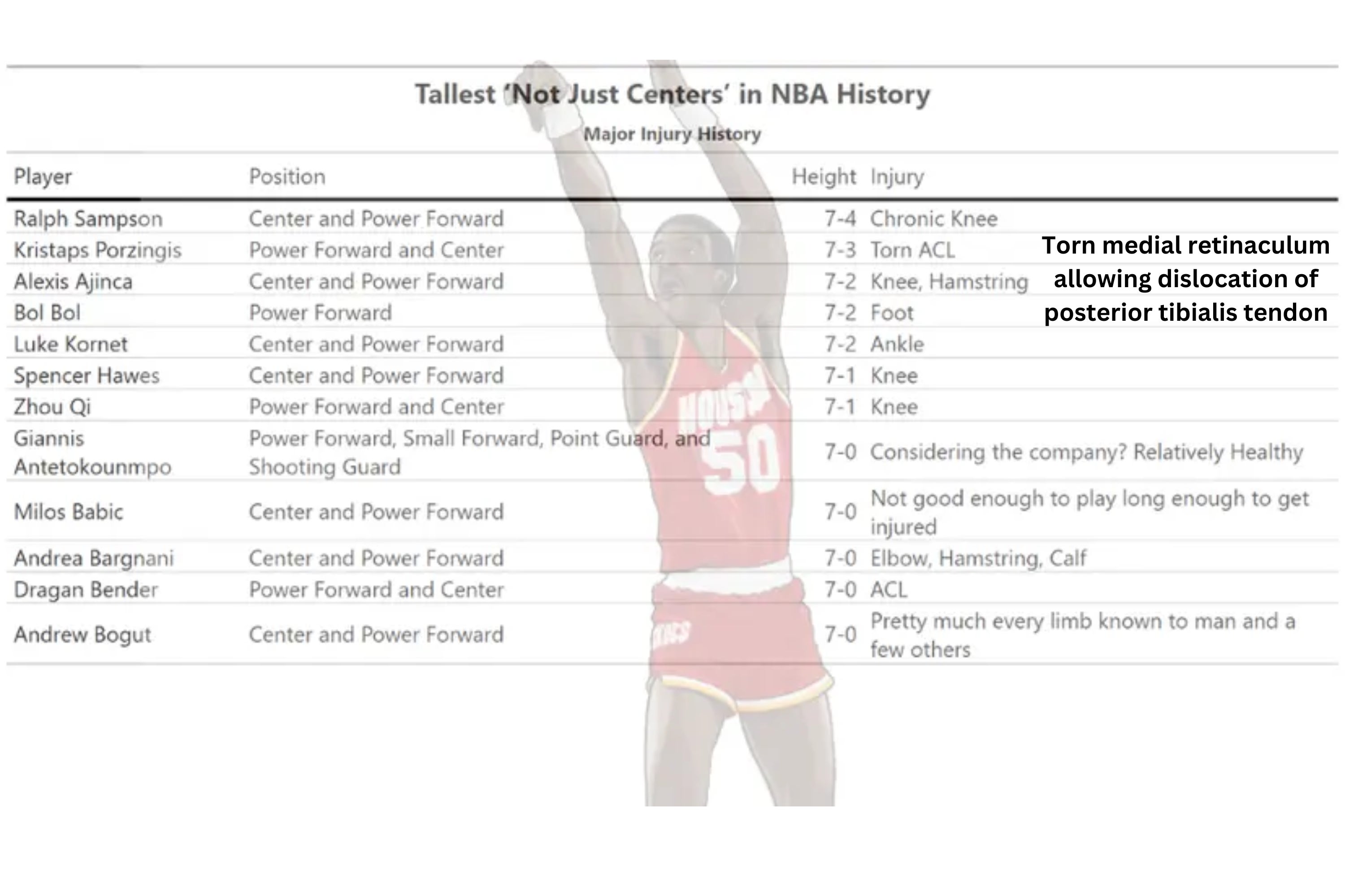 Let history be our guide here. I pulled the tallest players to ever play in the NBA who were listed as more than just a Center on Basketball Reference - indicating that they were actually atheletic - for a blog arguing the Spurs should have traded their Wemby pick for a kings ransom. As you can see it shows the injuries sustained and I added the latest one given to Porzingis from his possibly shady medical mechanic.