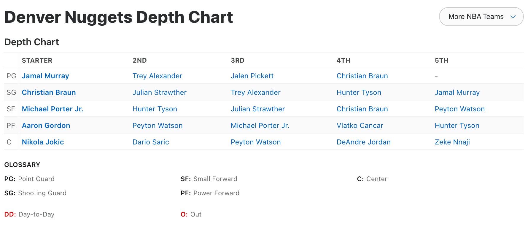 While I'm sure Dunn will be fine on the Clippers, the real story here is obviously Westbrook and the Nuggets. Before this trade, this is what their depth chart looked like