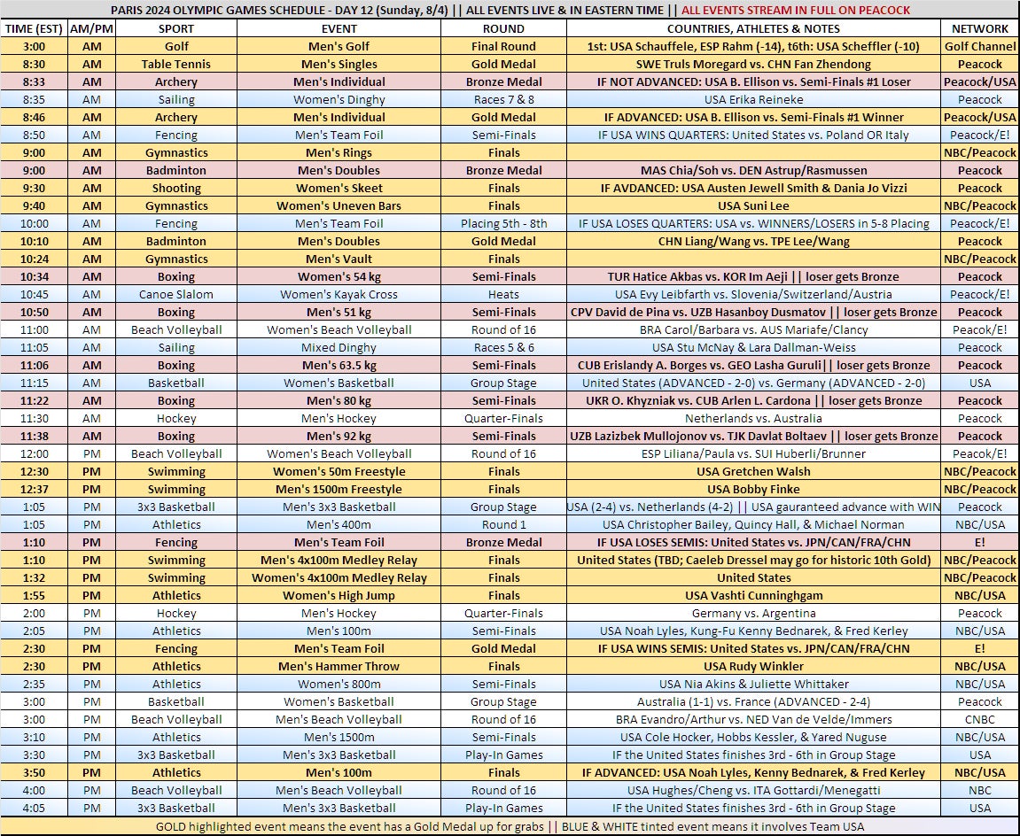 - Basketball: Team USA has the Women taking on Germany in their final group stage game. They took on Germany in an exhibition a few weeks ago, and have to beat them again in order to take the group and the #1 seed in the draw for the knockout round. The women losing tomorrow would obviously be shocking to levels you can't comprehend.