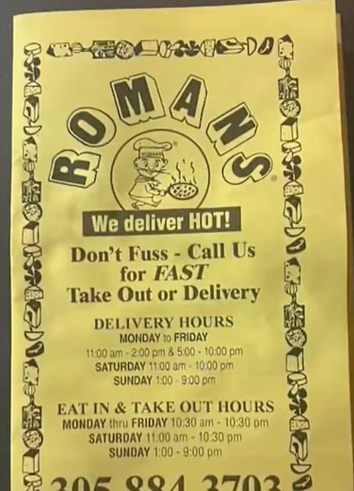 The popular pizza spot in Miami Springs is called Roman's Pizzeria (real flyer pictured below).