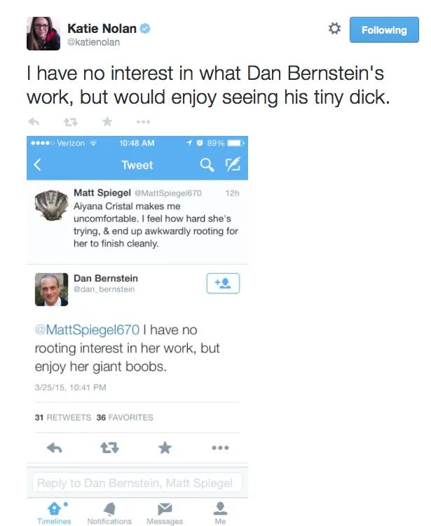 There's also a Big Cat blog from 2015 where Bernsy got in trouble with Michelle Beadle and Katie Nolan for tweeting about sports journalist Aiyana Cristal's boobs.