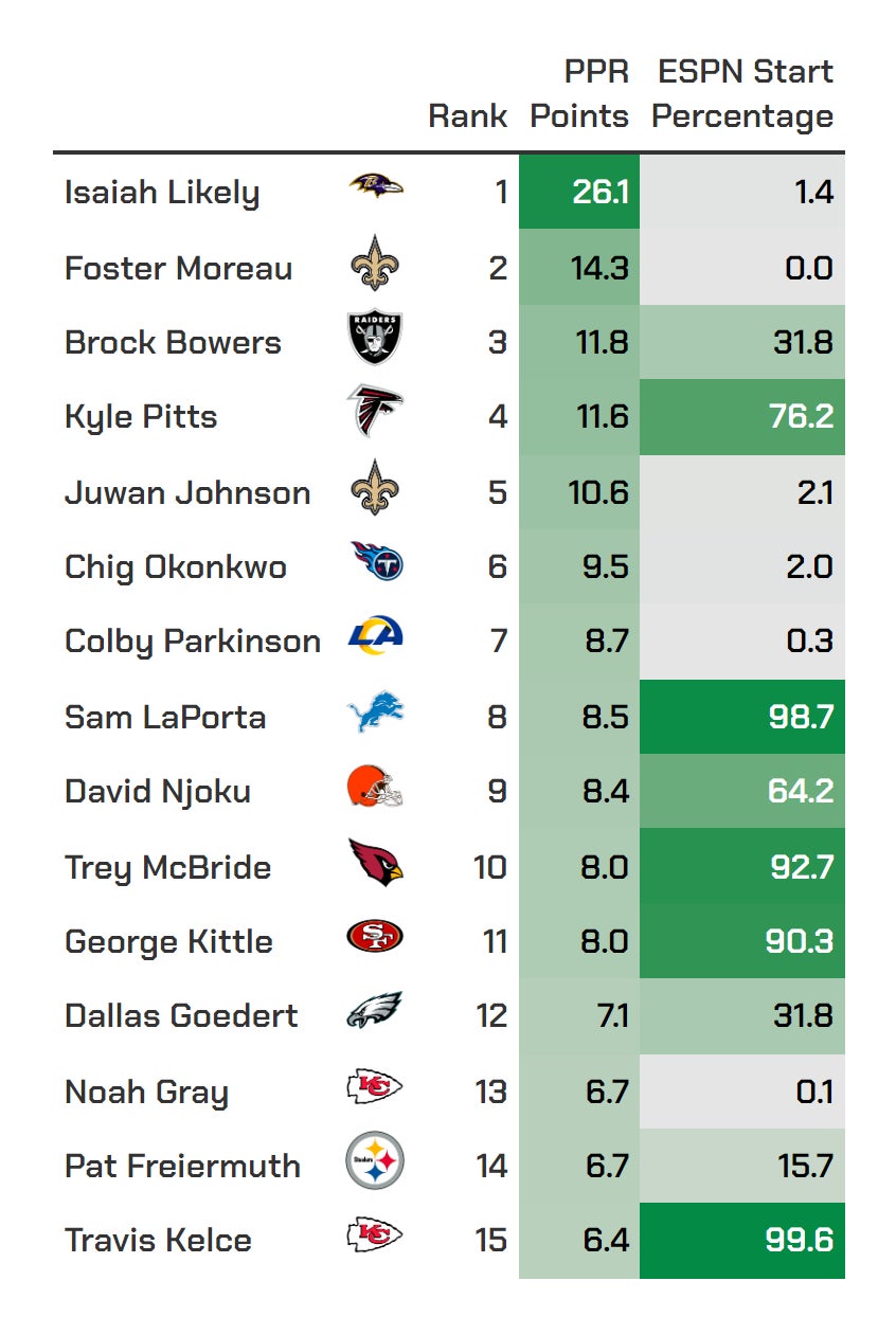 I know. It's one week. But this was just a complete turd even for tight ends. Here are the top-15 of Week 1 listed in order of PPR points along with each player's average league start percentage based on ESPN leagues.
