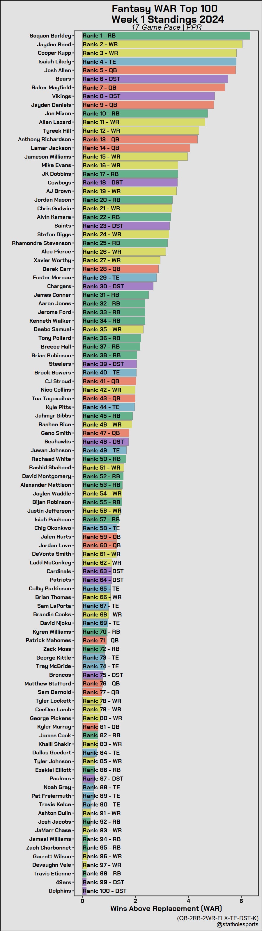 Hell yeah - another take I can celebrate at least for one week and that's Josh Allen always being worth a first round fantasy pick. #5 overall and you can understand why the model has him that high as offense was pretty lackluster league-wide in Week 1. Tua was the only 300-yard passer. Saying Allen has been valued as a first round pick isn't to say I would recommend drafting him there, but he should reward whoever grabbed him in the third round.
