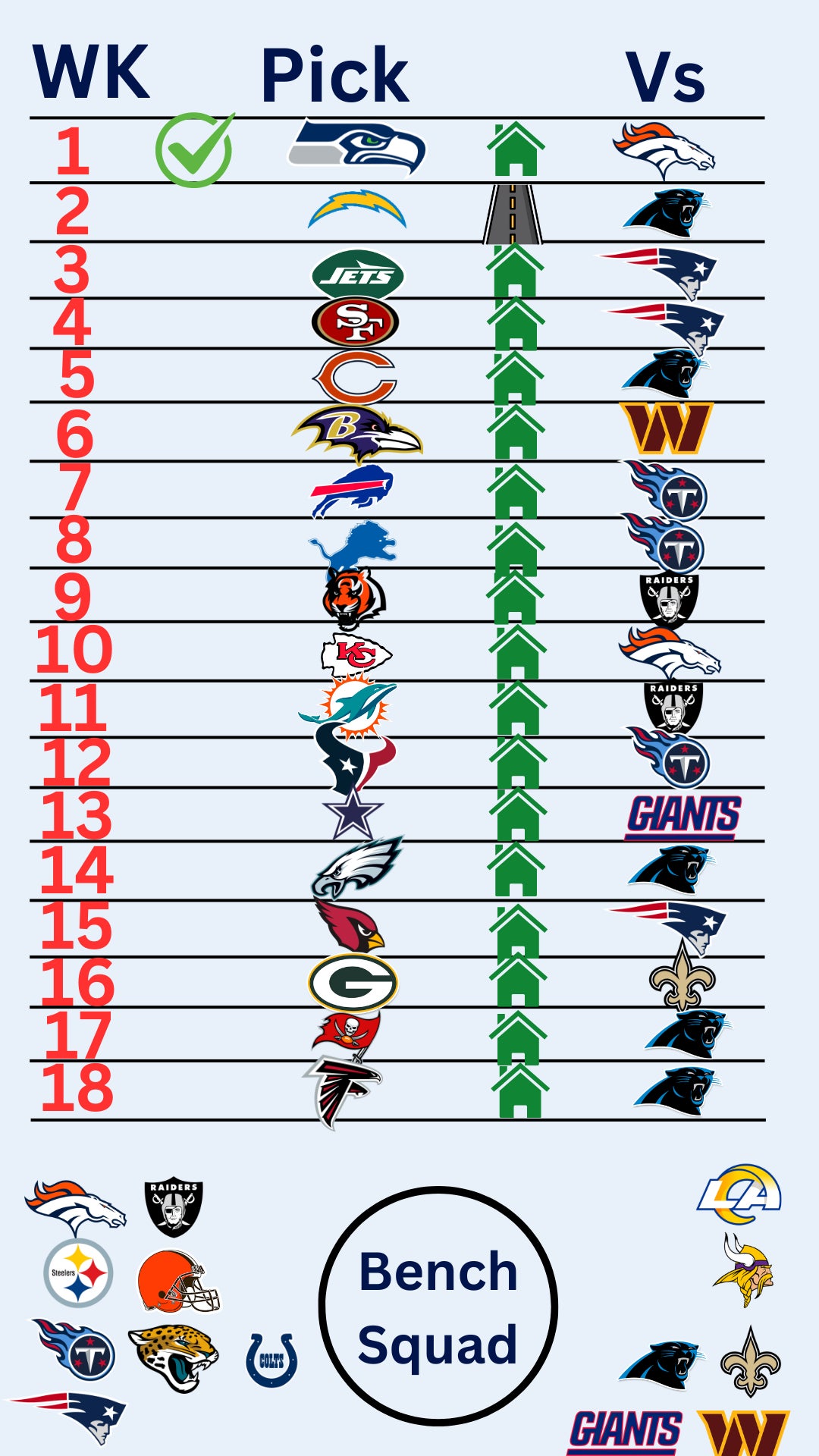 But that's not the real reason I'm staying away. I have Baltimore penciled in for Week 6 hosting the Commanders as it stands now. It's a tough week. Other possibilities include Texans at Patriots, 49ers at Seahawks, or Eagles at home vs the Browns. I'd gladly shift to Eagles here if it weren't for a brutal Week 14 when they play Carolina (byemageddon by the way) in which the only other good looking entre at this point is 49ers at home for Chicago. So long as Caleb Williams doesn't figure it out by then.