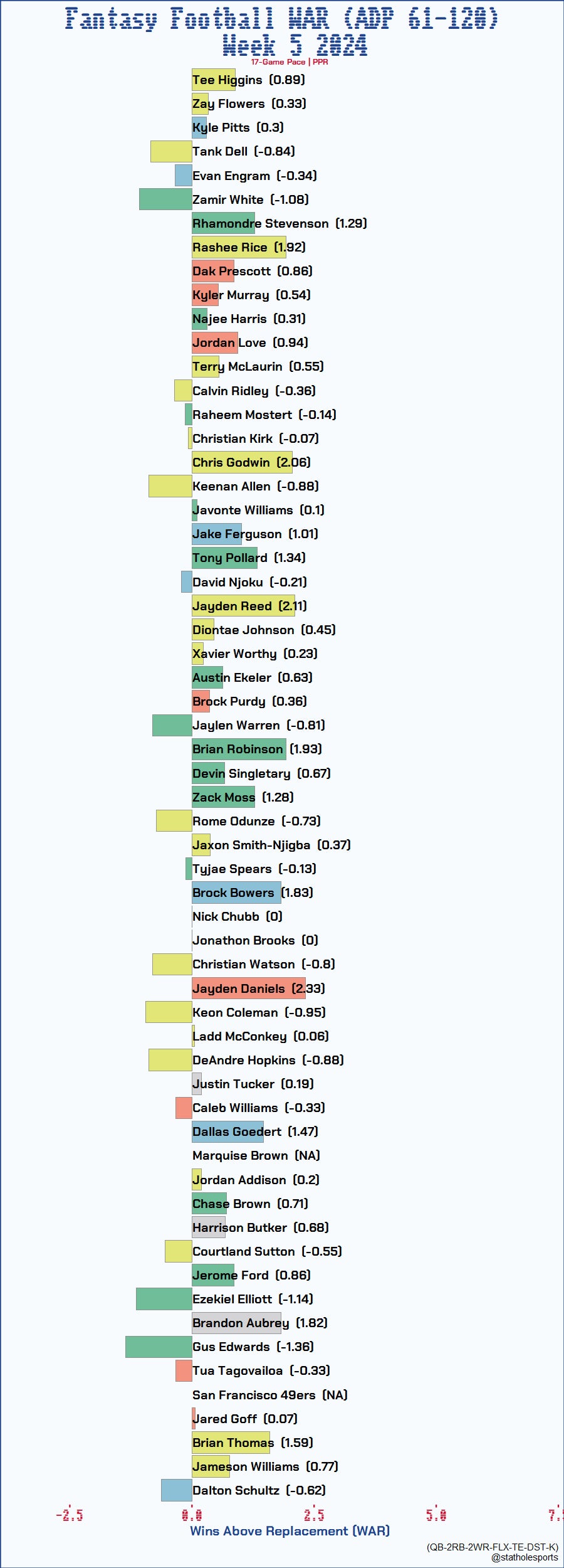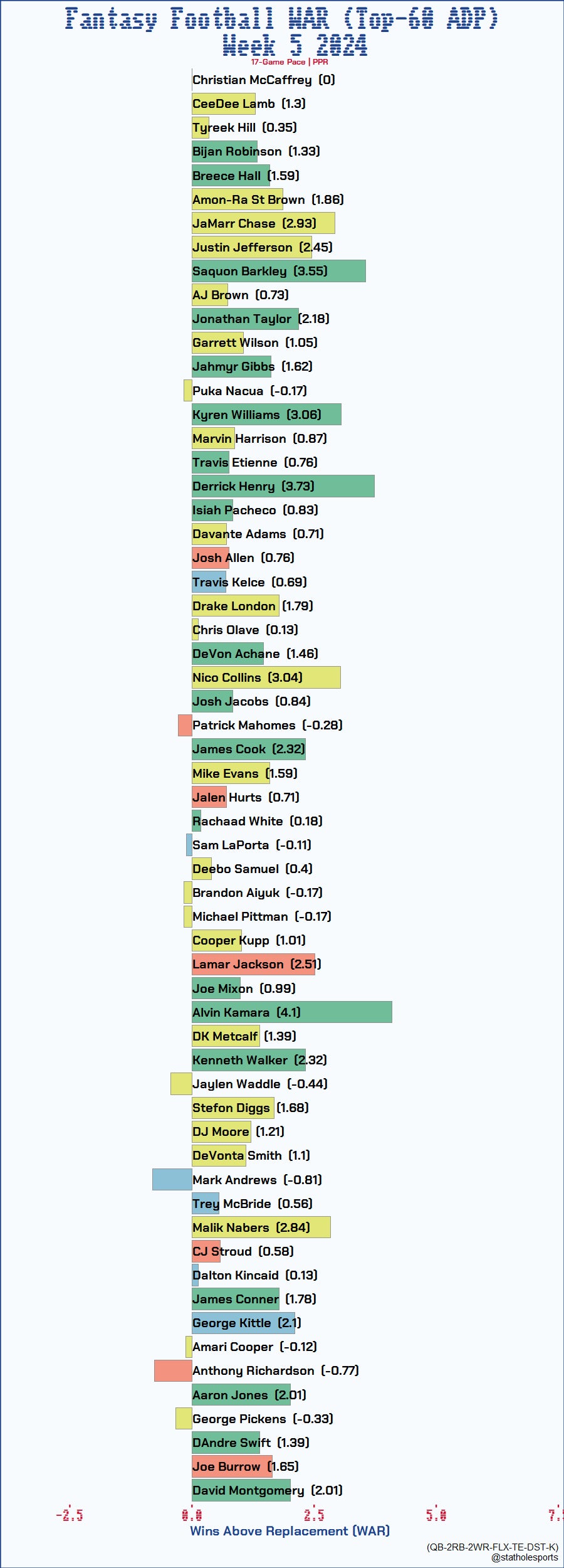 Quick caveat with the graph. It's very misleading early on in the season when byes start. The only reason Barkley isn't still #1 in WAR like he was after Week 4 is because the WAR model inputs a replacement-level performance for any game missed - even byes. And when it's only Week 5, that means 20% of Barkley's performance is on par with guys like Tony Pollard, or Ricco Dowdle. Pretty much any Cowboys running back of past and present. Things will even out as everyone else enters their bye weeks.