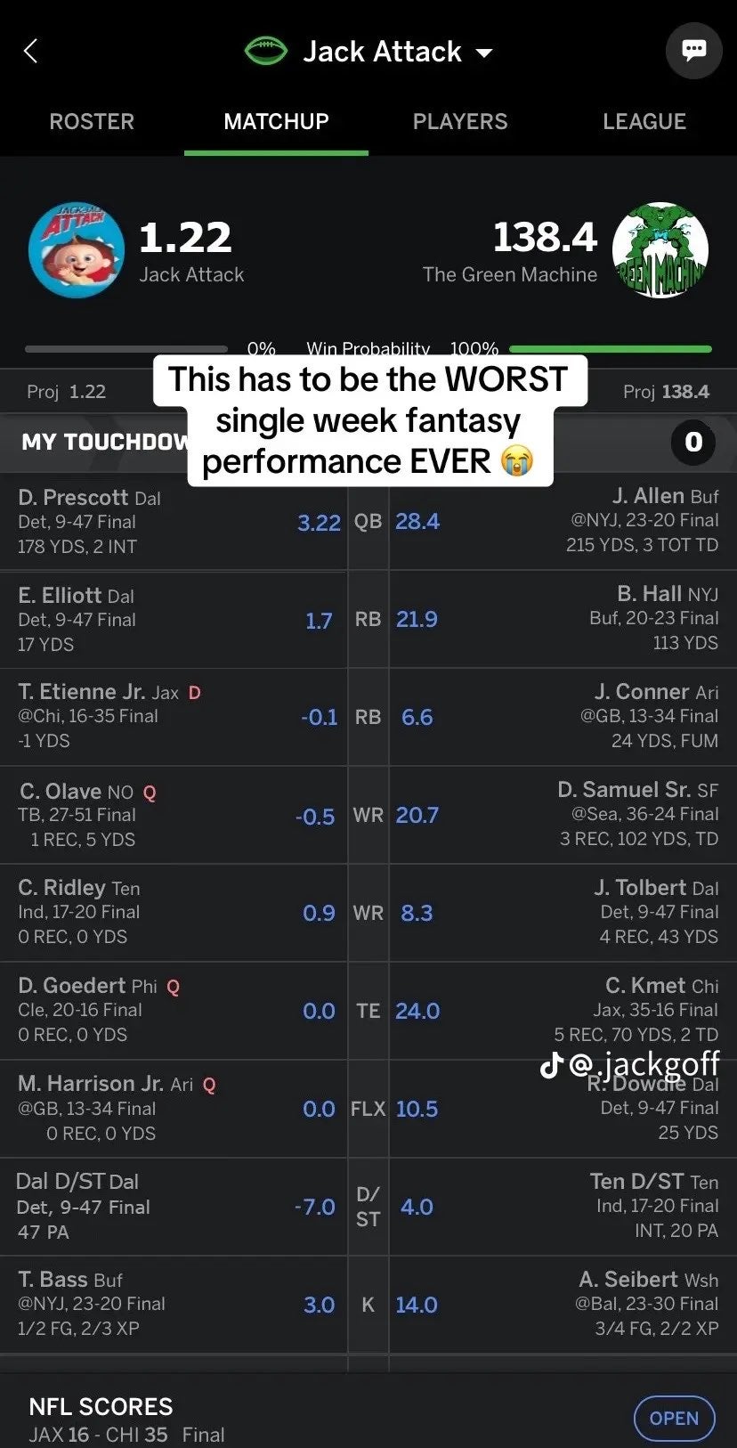 A Full Breakdown Of The Worst Fantasy Football Weekly Score Perhaps Ever Recorded (1.22 Points)
