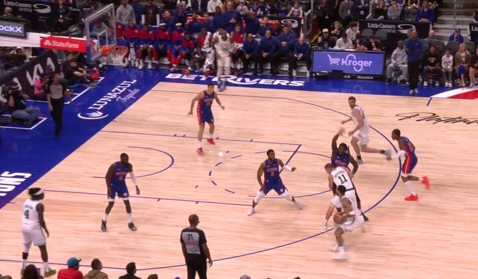 The Kornet screen comes HIGH as shit which allows Tatum to have the space to start to get downhill, once the Pistons switch, you see Pritchard in the perfect position to screen Kornet's man, which gives Tatum all the space he needs since Prichard's defender is way below the line in drop. You give Tatum this much space