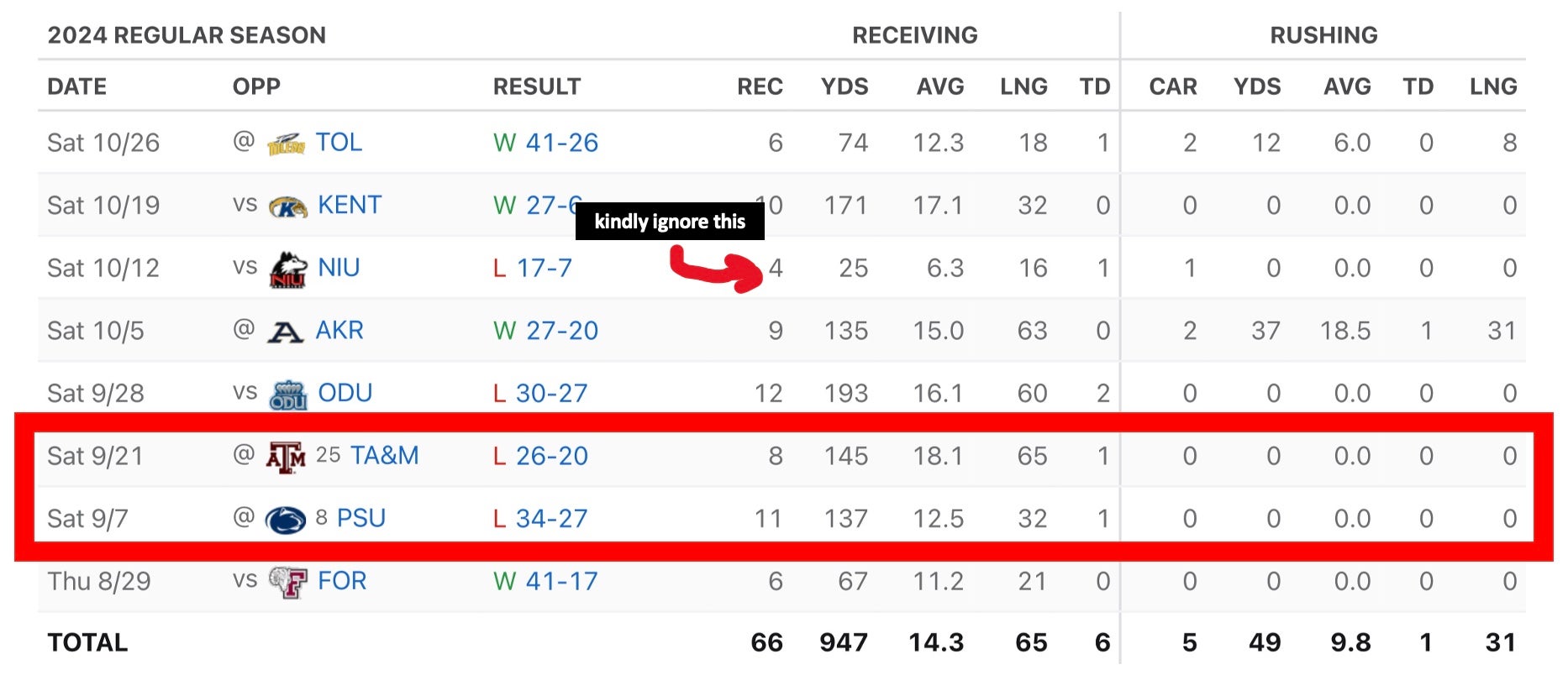 The Harold Fannin Jr. haters, who primarily exist in Happy Valley because they refuse to admit that their superstar TE Tyler Warren is in fact not the best TE in college football, will tell you Harold Fannin Jr. is only putting up numbers because of the competition he faces in the MAC. Which is not entirely wrong. Overall he plays far weaker defenses than Penn State. But early in the season when facing the likes Penn State and Texas A&M, Harold Fannin Jr. still managed to be the best player on the field in both games.