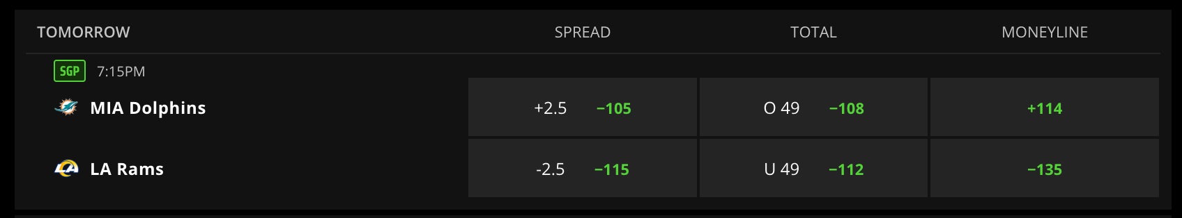 Tonight on Monday Night Football, we've got the 2-6 Miami Dolphins at the 4-4 LA Rams -2.5 (49).