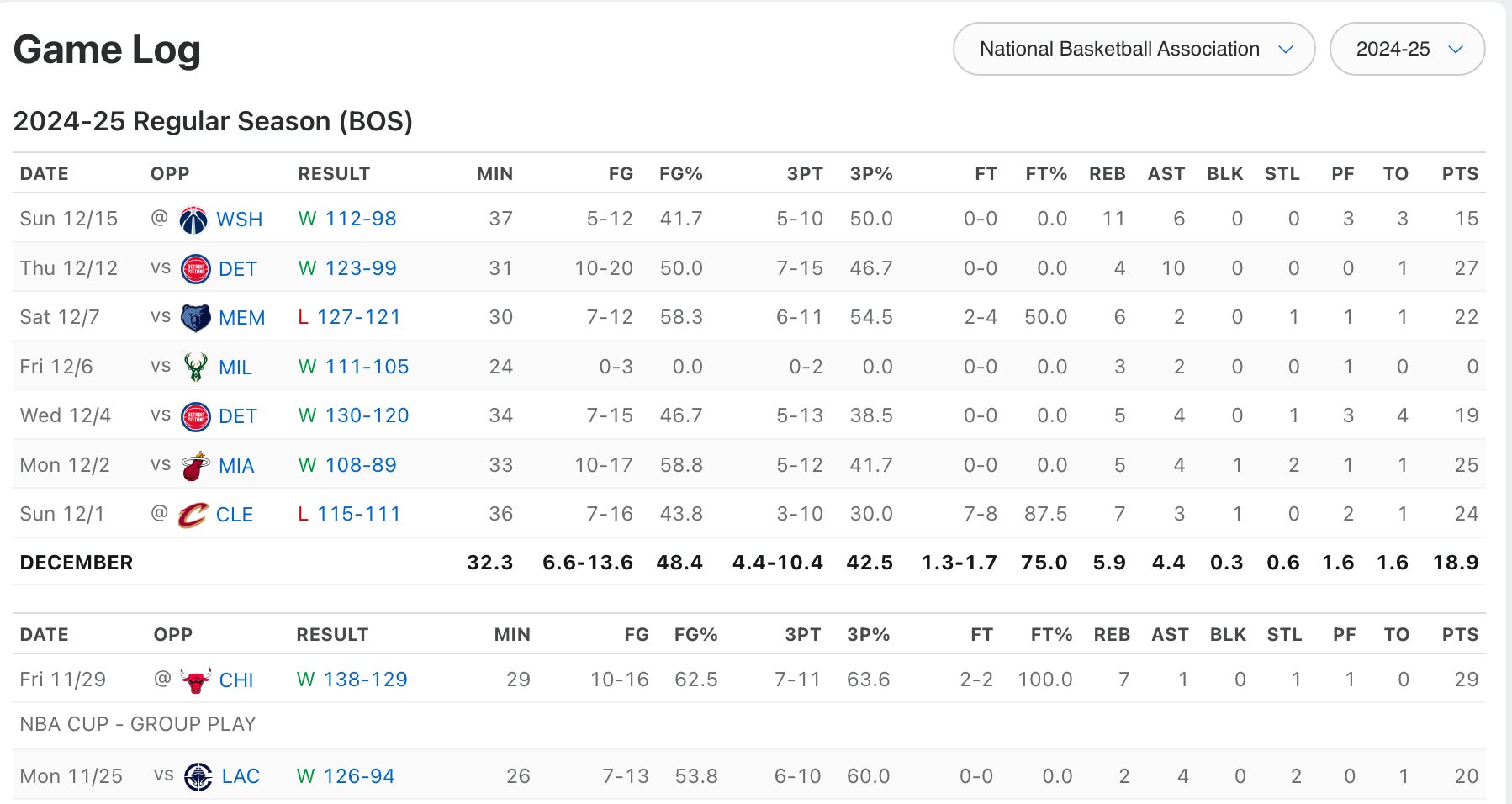 I don't want to make it seem like I don't t think the NBA Cup provides value just because the Celts aren't in it. I hate when people do that. Oh what, now it means nothing just because you lost early and didn't advance? That's lame. There's always value in competitive games. But if you aren't going to make the trip to Vegas, I'm not sure I could have asked for a better outcome. There's also value in stacking Ws and getting a SHIT TON of rest for your best player and ageless wonder PF which will help you moving forward. It's not often you can buy guys another All Star break in December all while not missing a ton of games, and considering how important it is for the Celts to finish the season as healthy as possible, that's a huge plus.