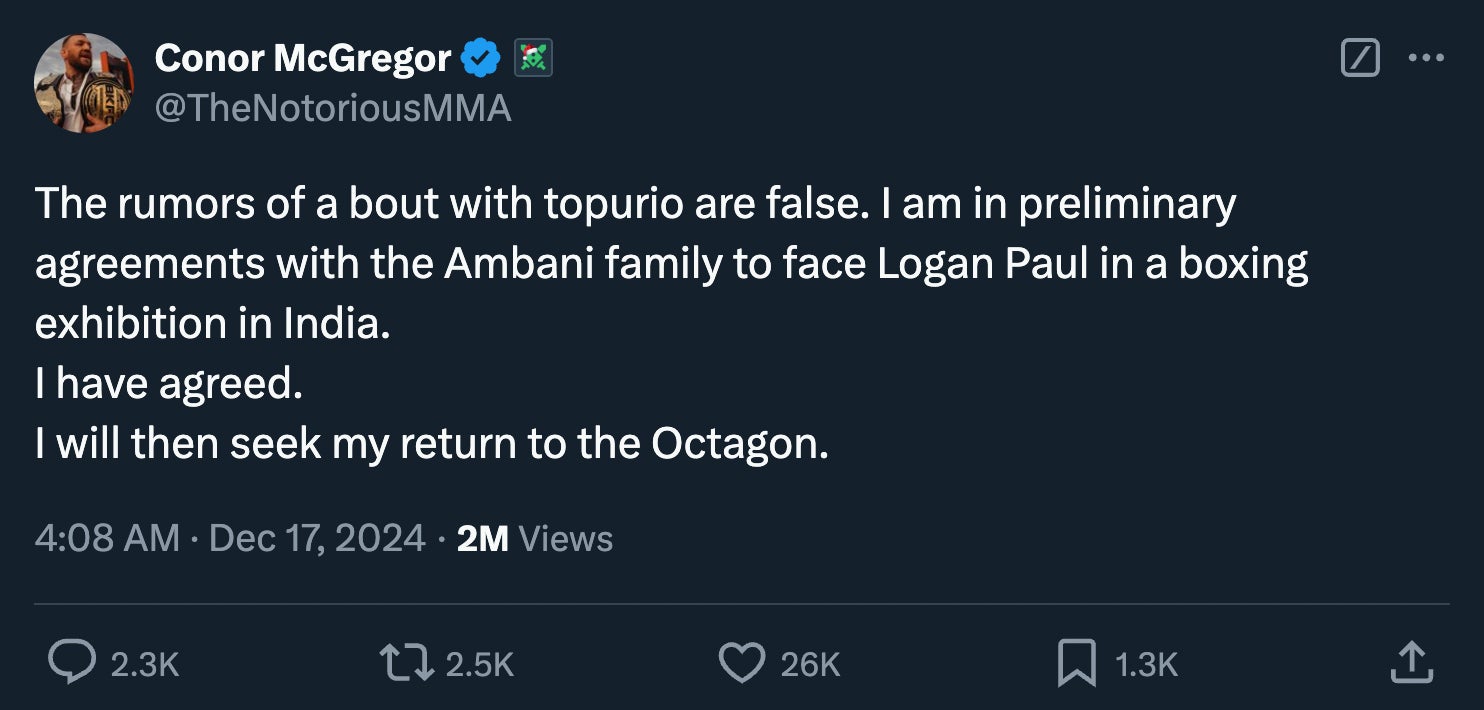 Earlier this morning, Conor McGregor tweeted that the rumors of him fighting "Topurio" (Ilia Topuria) are false, and that he is actually "in preliminary agreements with the Ambani family to face Logan Paul in a boxing exhibition in India".