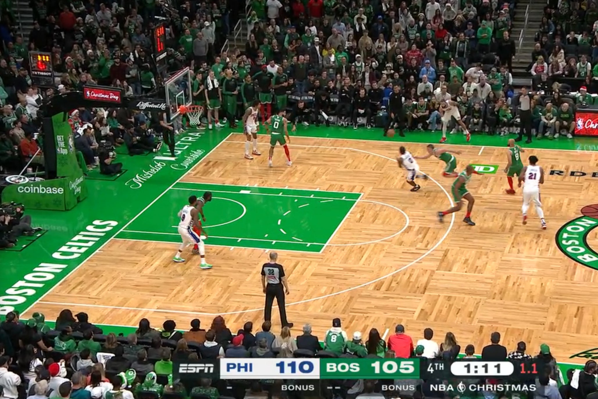 Multiple breakdowns, first with Pritchard at the top of the key, and then again on the back line with Jaylen Brown. With 1.1 seconds left on the clock, you have to be early with your help in that situation the second you see Maxey start to get down hill. Right here