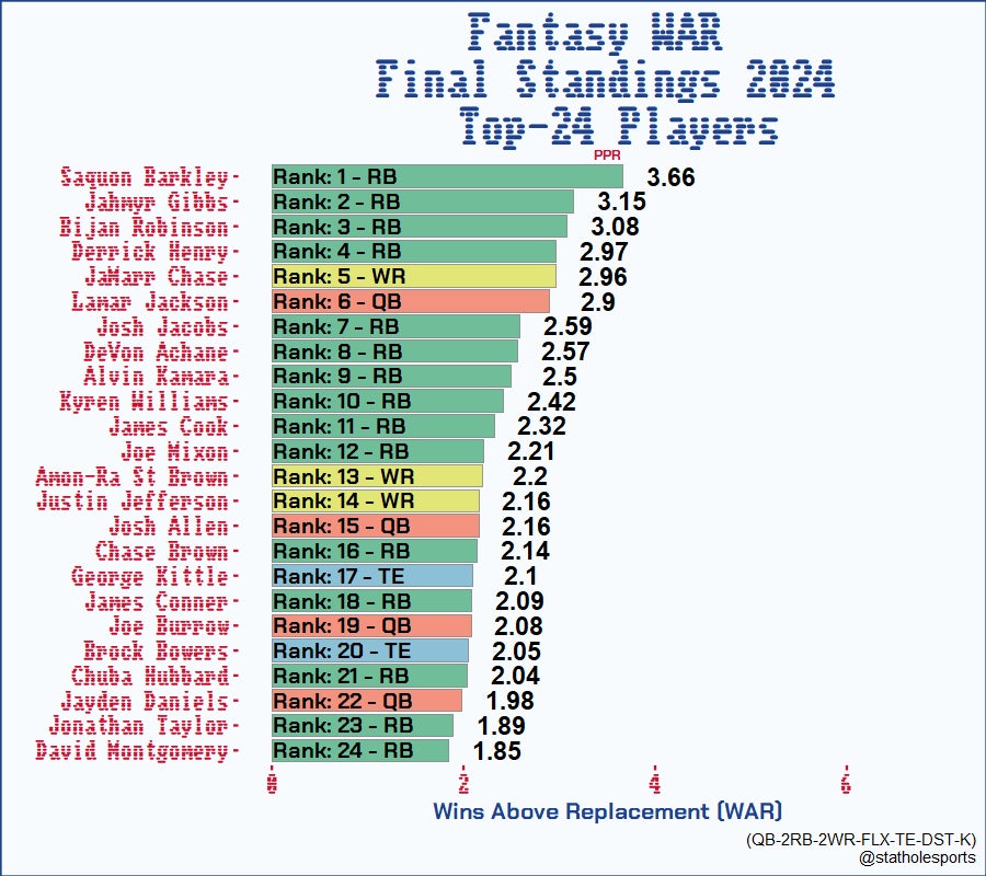 Not exactly a big reveal that Saquon Barkley back hurdled his way to the #1 player in WAR, but being worth almost half a win more than the #2 player (Bijan Robinson) gives some measure of how much better he was than everyone else in 2024.