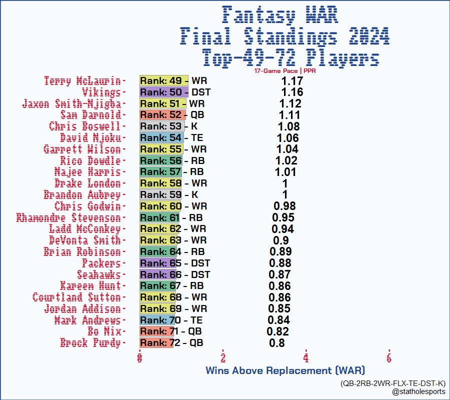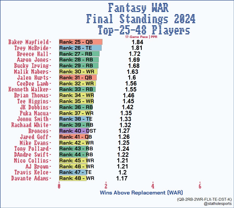 Rest in piece being a sure-fire middle first round pick. We all knew the run was sort of over but there was a chance he'd regress back towards his dominant self of old in 2024. But no dice. Even in a dark world of tight end production, Kelce only gave teams a little more than one win more than teams using a replacement-level tight end. Just ahead of Davante Adams to wrap up the fourth round.