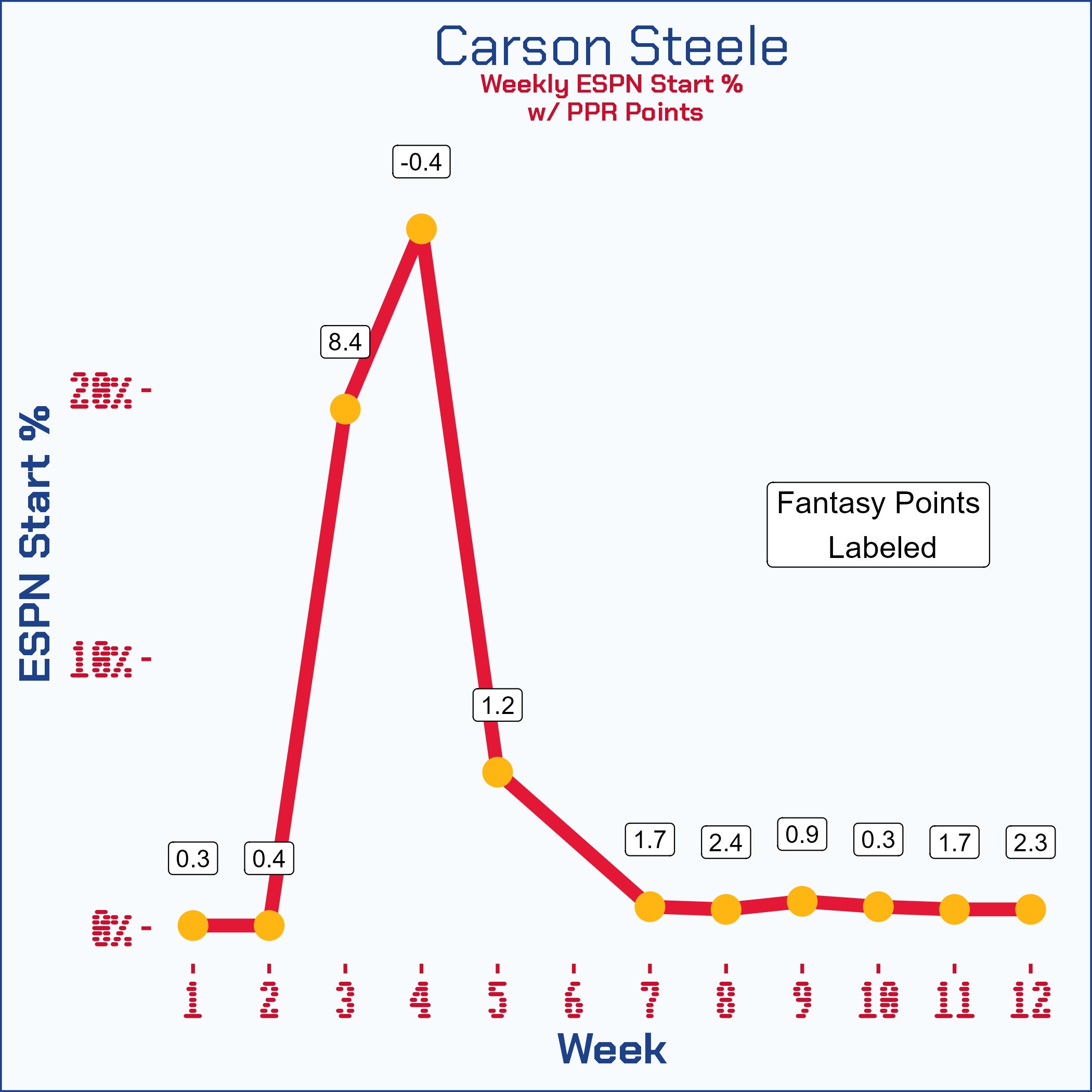 Let's start with some honorable mentions. First up is Carson Steele. The out of nowhere full back style running back who got his chance after the Pacheco injury. The 8.3 Week 3 wasn't so bad but for some 25% or so of leagues that played him in Week 4, it was a disaster. Worst RB performance of the year (-4) for those started in at least one percent of leagues.