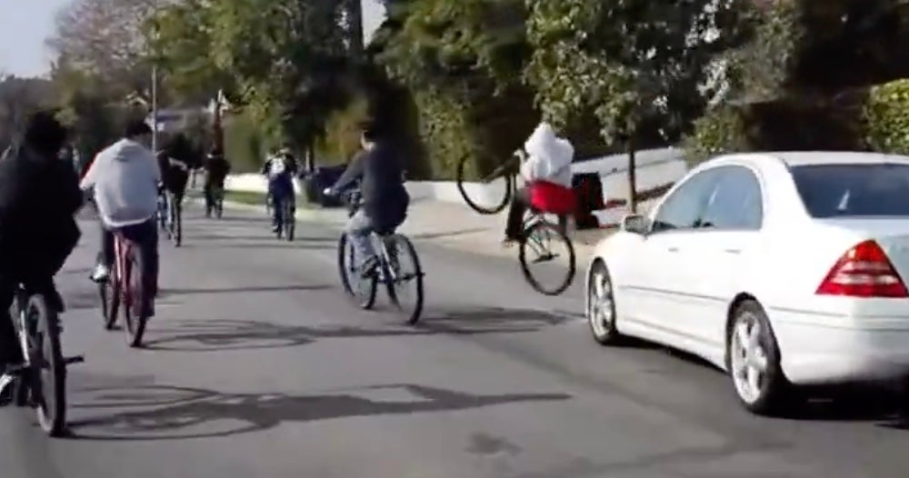 Up until the beating, and the eventual destruction of this man's Mercedes C230, I'd say this was fair play by both parties. Cyclists vs drivers is an age old rivalry. On one hand, the Cali teen bikers are simply filling their role in society. When you opt for bicycle as your mode of transportation, it's your civic duty to inconvenience as many drivers as humanly possible. The laws of the road don't apply to you. Except for when you want them to. In this situation they don't. And if Cali teens don't occasionally throw an impromptu mid-day bike parade that nobody asked for in a high traffic area, then who is going to bless Los Angeles with the sickest fucking wheelies you've ever seen?