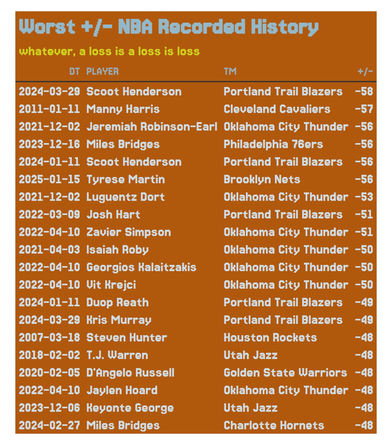 Tough look for Scoot showing up twice towards the top of the list including the worst of all-time. But while a lot of recent Trail Blazers appear above, fans can at least reference the many OKC players from a few years back as a path for hope. Maybe Anfernee Simons can be that guy (had a -36 Thursday night).