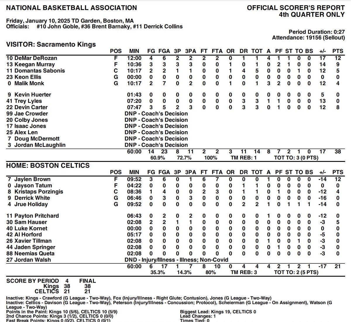 The first quarter was a perfect example of this. The Kings came out firing, taking 18 3PA in their first 30 FGA. On the flip side, the Celts focused primarily on 2s early, winning the points in the paint battle 14-10. Did that matter? Of course not, because they were already behind the 8 ball in terms of 3pt shooting. The quarter ended 8-4 3PM, and the Kings found themselves with 34-27 lead.