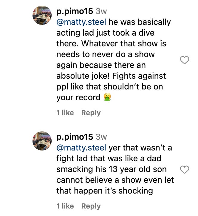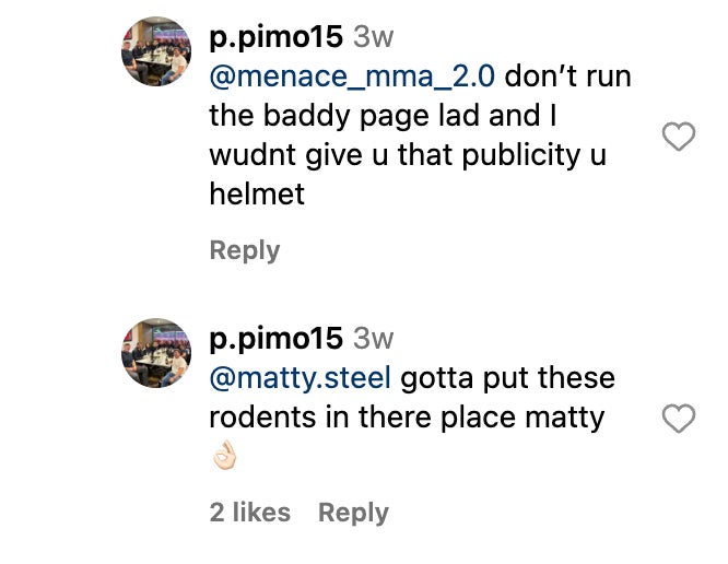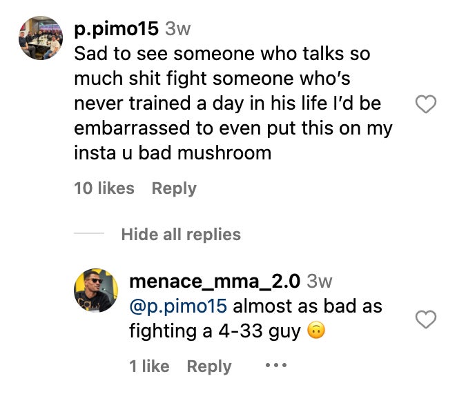 ….and Paddy The Baddy entered the comments of that post to voice his displeasure with a professional fighter (who already has a bad reputation as it is, I'll get to that in a second) beating the shit out of an amateur and then bragging about that "win", and got into a back and forth with Denis.