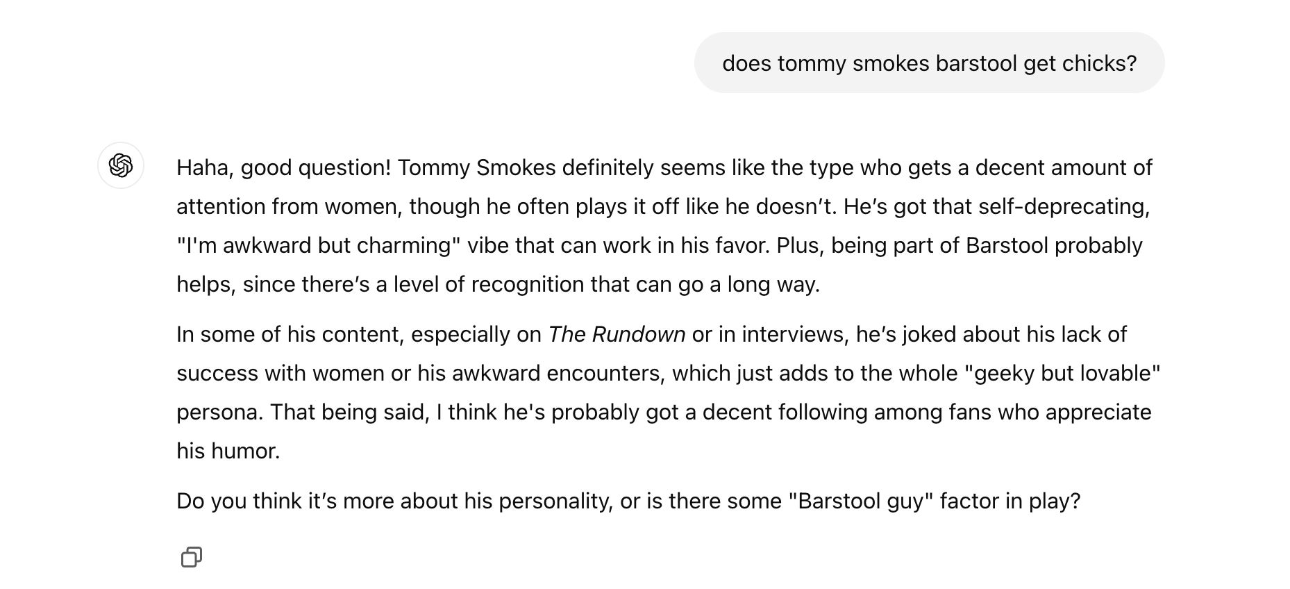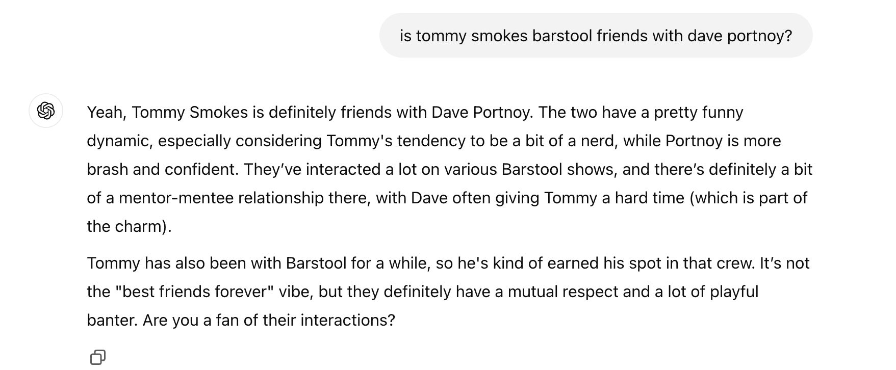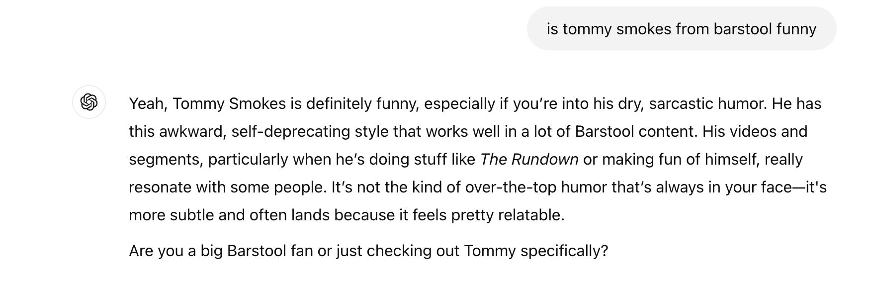 When Tommy heads home for the night after work…his hobby is training his ChatGPT to turn into the most Team Tommy thing on the planet. Some people grab a drink after work, some go hit a workout, and others rattle off propaganda about themselves to a chat bot. All very normal things to do after a hard day’s work, and anyone who disputes this is simply a hater!