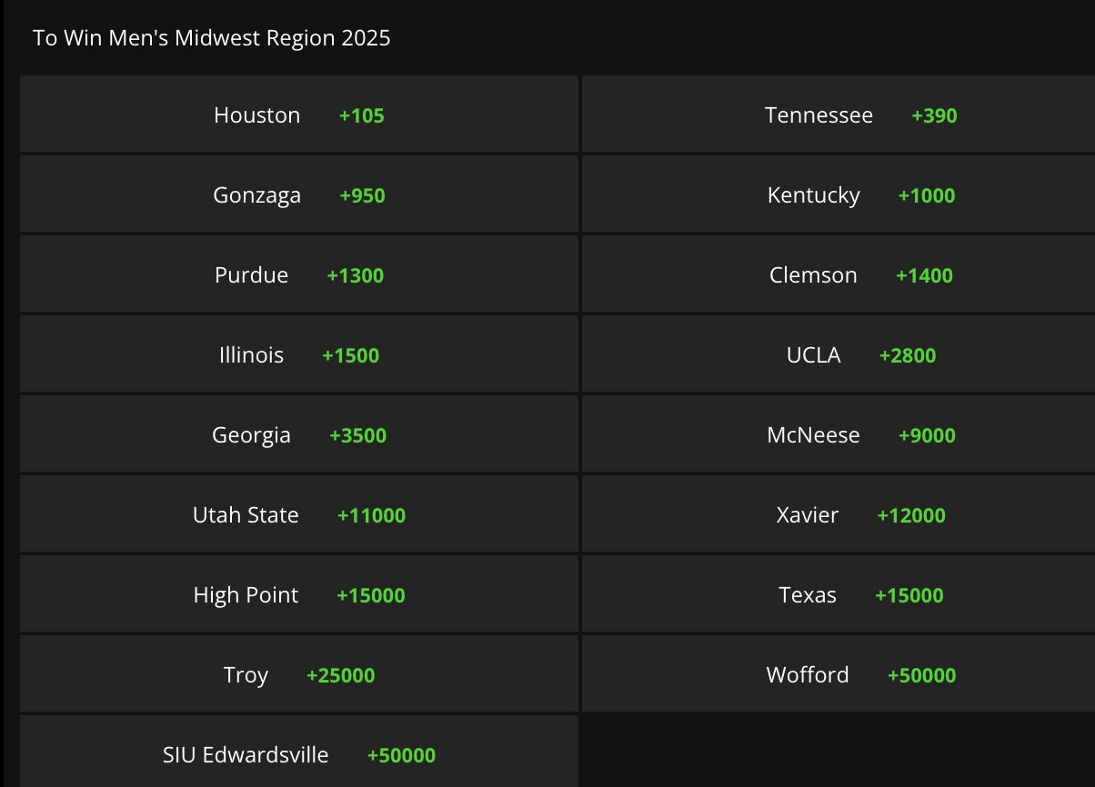 I don't know how to pick against Houston here. They are basically a better Tennessee. Kentucky is injured, Illinois can't be trusted, Clemson lost Dillon Hunter to injury, Purdue is inconsistent. Gonzaga is the only longshot I can see here or willing to take at all. They have the top-10 KenPom ranking so they are good. It just feels like Houston's year. There's no other way to look at this and I can't see a true longshot coming out here, even if you consider Gonzaga a longshot 8 seed.