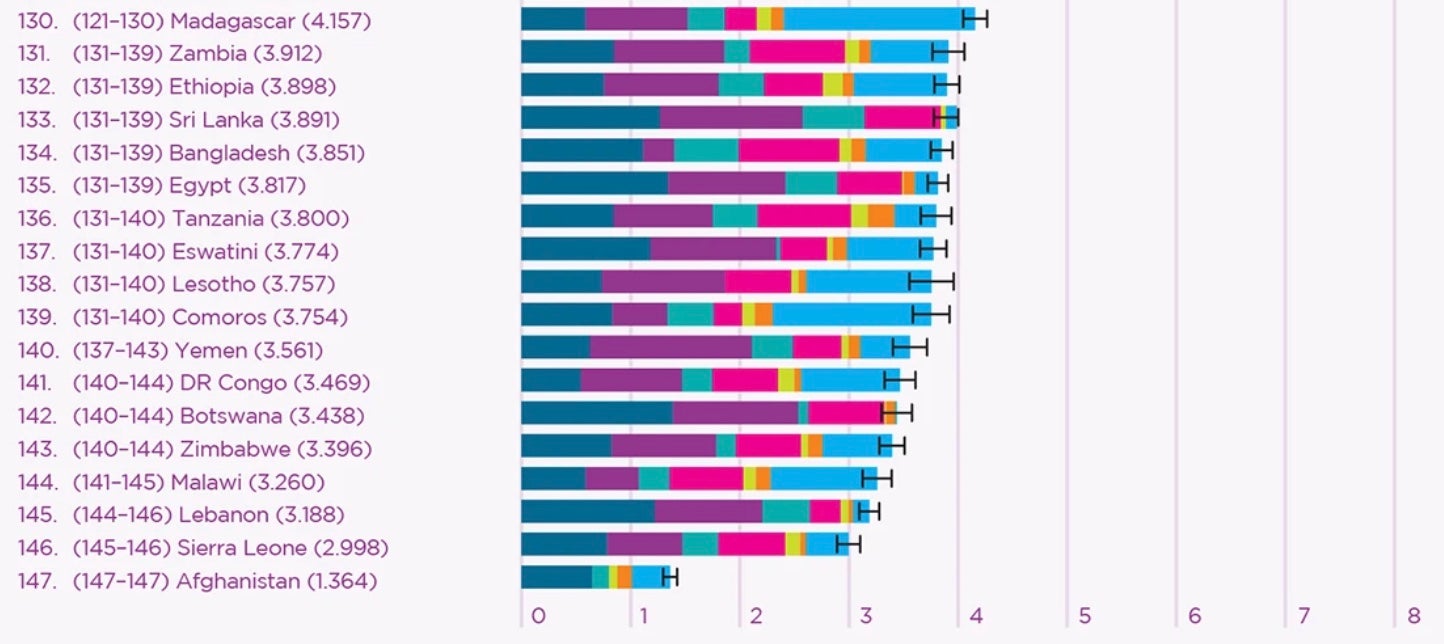 My god, Afghanistan. I suppose that's what you get when you ban half of your population from looking out windows. That's how you end up with a non-existent 'Freedom to Make Life Choices' bar. What a fumble by the Taliban to allow the people of Afghanistan to get their hands on this survey. If you're going to go full religious heel and commit to making your country as miserable of a place to live as possible so that you'll get to swim in a pool of virgins when you die, you can't be letting your people fill out "Are we happy?" surveys. Big misstep on their part. Nobody does PR worse than Afghanistan. They could learn a thing or two from North Korea.