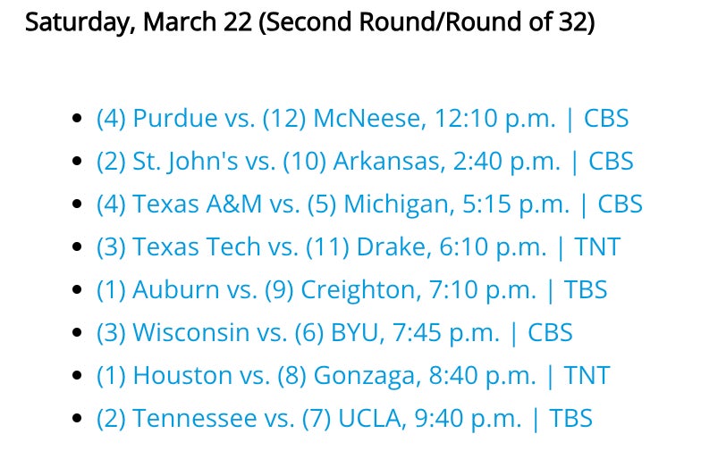 Okay, so I used the word intriguing here because I truly think it is based on how the tournament has gone. I love the second round. You get the mix of big time matchups, the darlings of the 1st round trying to make history vs a big time name. There's an extra level of nervousness of getting out of the first weekend. You need that break as a fan to regroup and get ready for 2 more games next week. We're really looking at a perfect day of TV right now. We'll touch on the games later but look at the matchups we have today. Drake/Texas Tech is a stylistic mismatch. Pitino/Cal. Auburn against Kalkbrenner and defense there. BYU/Wisconsin could be the game of the tournament.