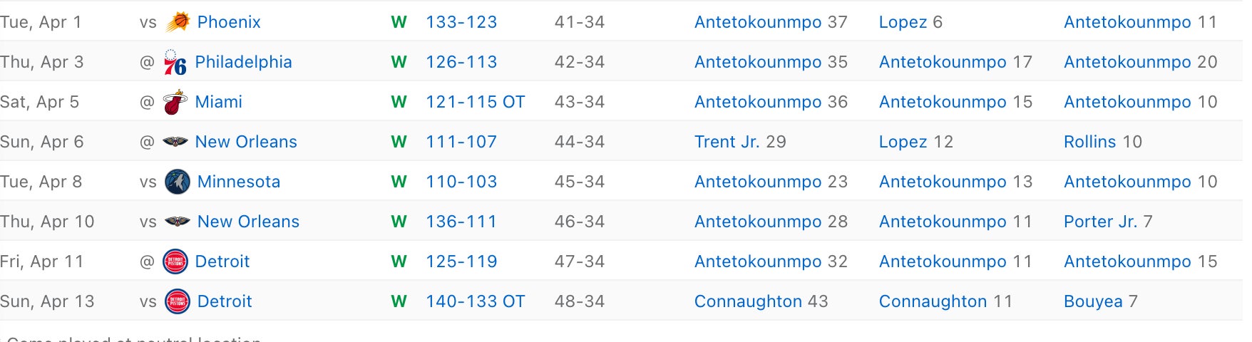 You also have Giannis playing some of the best basketball of his life, and finally, he enters the playoffs healthy, which wasn't exactly the situation MIL dealt with this time last season. At the same time, this is a Bucks team that was just 17-21 against teams .500 or better. They now need to rely heavily on Kyle Kuzma and Kevin Porter Jr, which is never an ideal place to be. All year long, they've floated around 11th-12th in terms of offense, defense, and net rating in a season filled with drastic swings. They'd go on a nice winning streak, then lose 4-5 in a row, then immediately bounce back and win a bunch in a row etc. Zero consistency as to what you could expect from a night to night basis. For example, before that 8 game winning streak, the Bucks lost 4 in a row and 6 of 8. It's just how their season has gone.