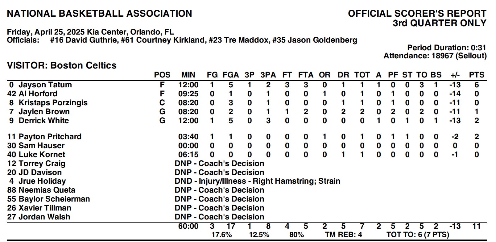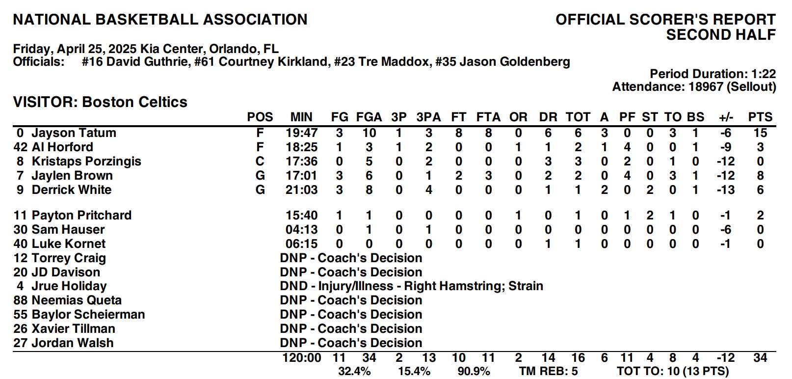 Then you end with the poor outside shooting. How does 2-13 (15%) in the second half sound? I have everything about it. The percentage is horrendous, but only 13 3PA? Gross. The Celtics allowed the Magic to take more 3PA in this loss. They did not embrace Mazzulla Ball and it cost them. Not only was the shooting brutal, the Celts only had 2 OREB in the entire second half/ See what a difference rebounding can make?