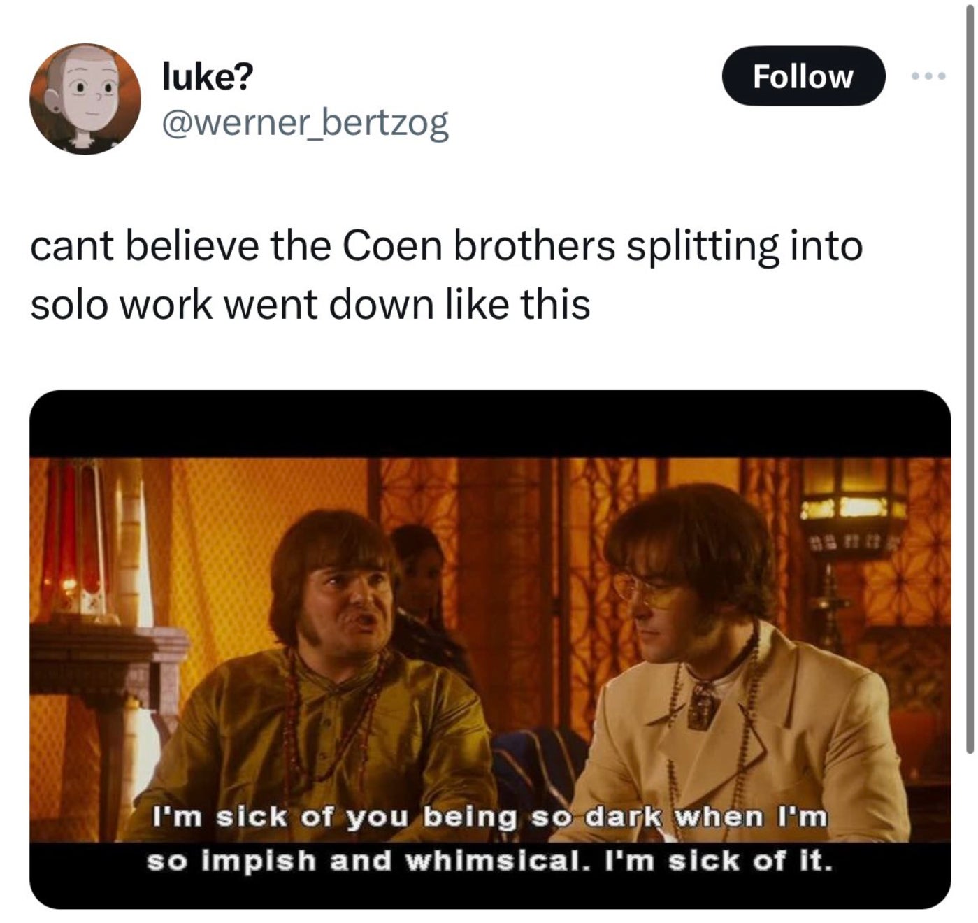 At the very bottom of that list and all film lists is 'The Ballad Of Buster Scruggs', that movie fucking SUCKED and was the 1st domino to fall in making me wonder, even together have these 2 BROTHERS lost a step?