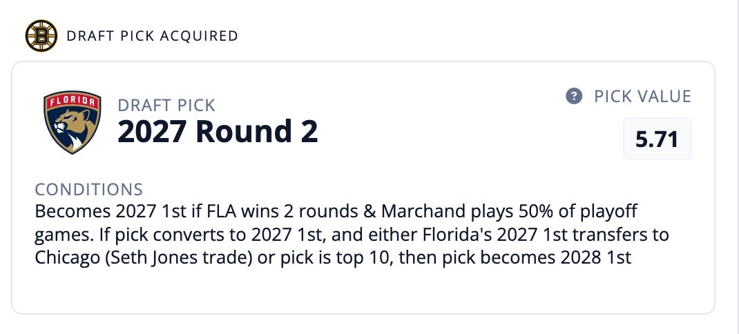 PuckPedia updated the trade stipulations to say that the 1st round pick will become a 2028 1st round if Florida's 2027 1st transfers to Chicago as part of the Seth Jones trade, or if the pick is top 10.