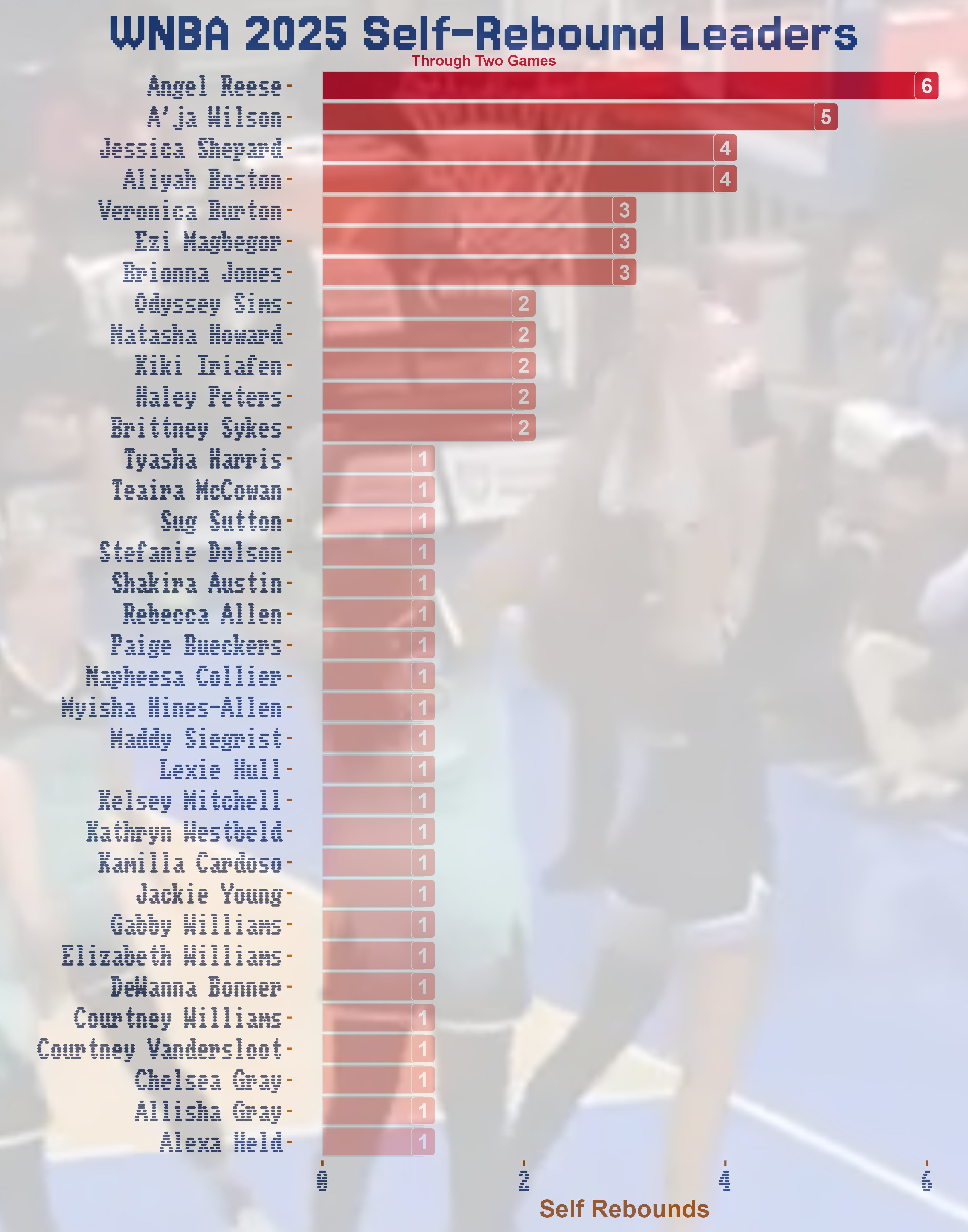 Six self-rebounds through two games puts her on pace for 132 for the season which would smash her WNBA all-time record of 50 from 2024: