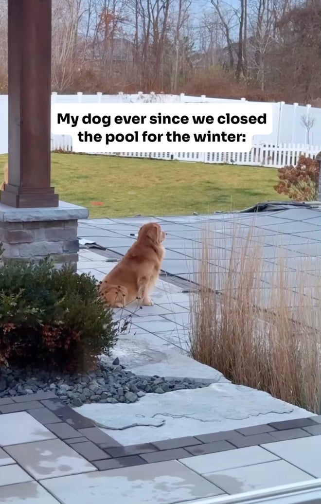 Dogs aren't stupid. They wake up, look outside, and know its not pool season. That's not what this is about. This is dog life 101. That famous saying - "a watched pot never boils"? Yah, that doesn't apply in dog life. You ever had a crumb of food in your hand that you completely forgot was there while you were lost in conversation with somebody? Only to look down and see those dog eyes piercing through you? Ears perked, the sweetest look they're capable of, right there on their face?