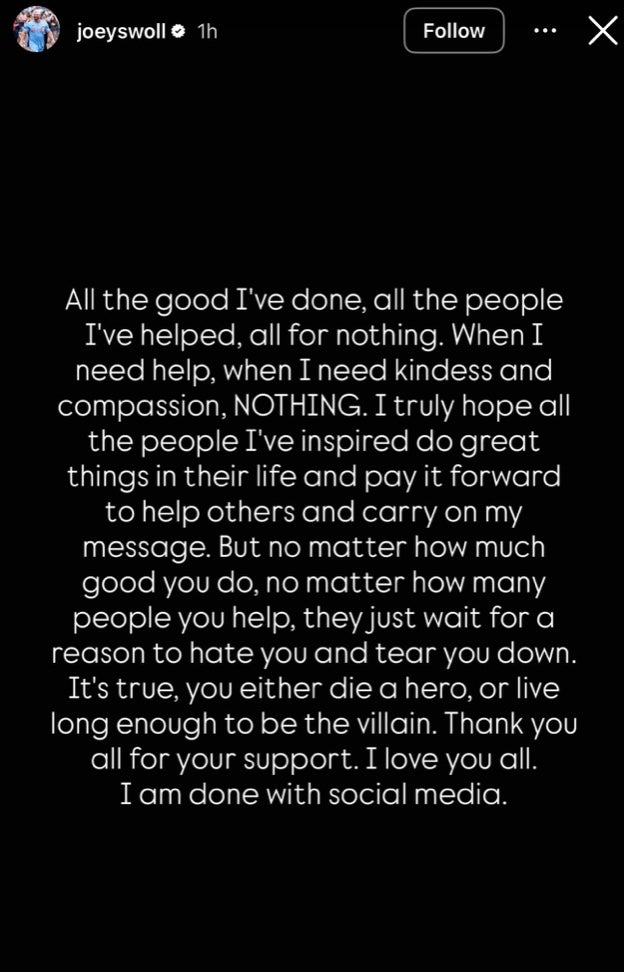 I'm not here to discuss the ethics of a Hulk Hogan tribute video. Just to give an objective review of Joey Swoll's last however many hours. He paid tribute to Hulk Hogan. He vehemently defended his tribute to Hulk Hogan. He then performed a full 180 and apologized for all the bad things Hulk Hogan has ever said or done. And for the grand finale, posting an Instagram story announcing his retirement from social media all together.