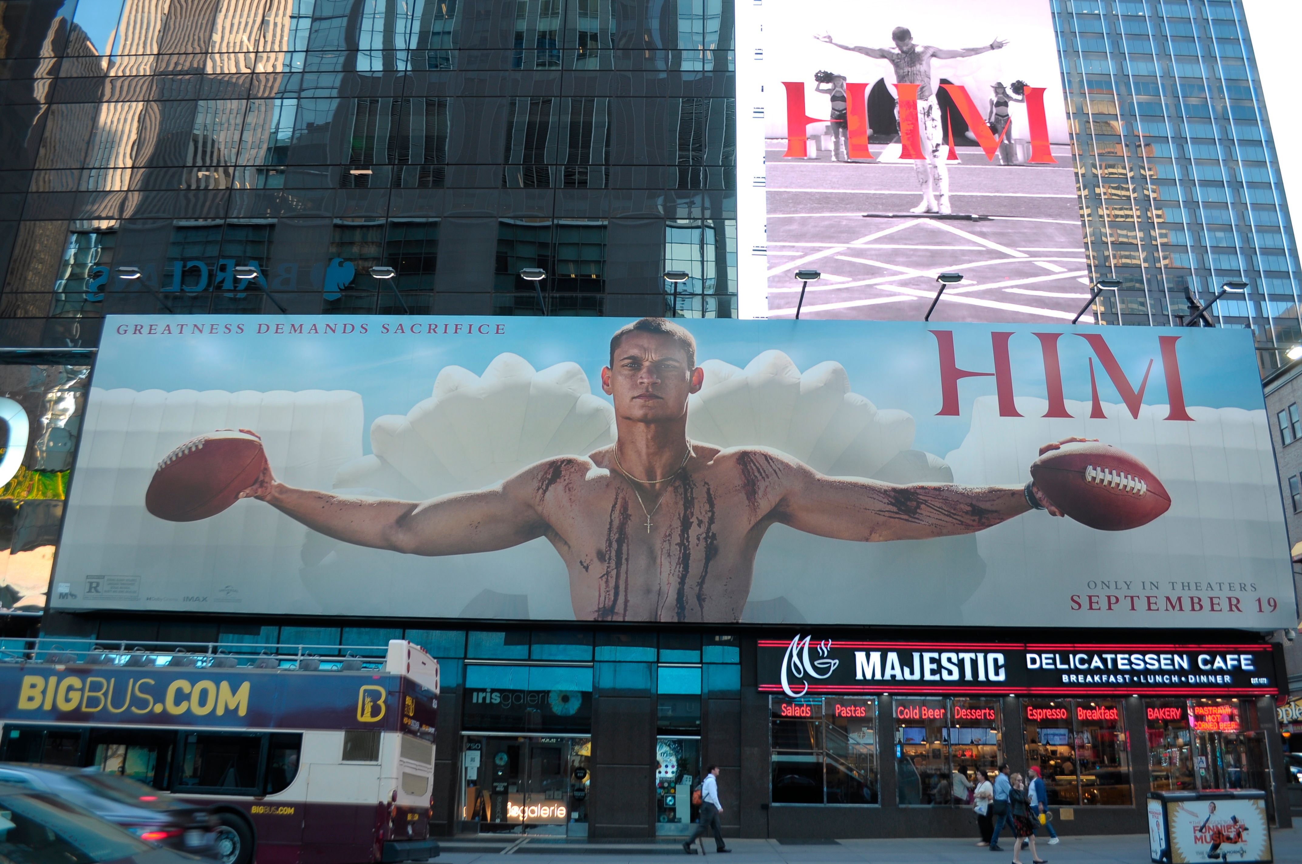 HIM opens in theaters nationwide on Friday and with a little time before the Thursday Night Football stream, I caught a 2:50pm showing. The movie stars Marlon Wayans and Tariq Withers (pictured above on billboard) and is about Withers' character being the next great QB. Wayans is the established GOAT and going into year 20 as an NFL QB that has won eight rings.