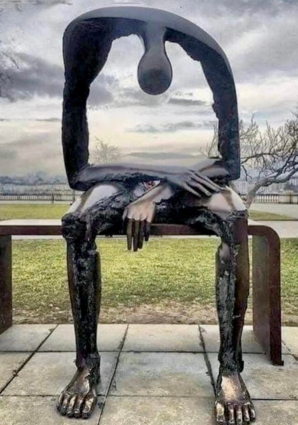 This bronze sculpture, named "Melancholy", was created by Hungarian Sculptor Albert Gyorgy. It depicts a figure sitting on a bench with a large hole in its center, representing the emptiness and void caused by profound grief, a feeling the artist expressed after the loss of his wife. It's located on the shores of Lake Geneva, Switzerland, in a park along the Quai du Mont Blanc.