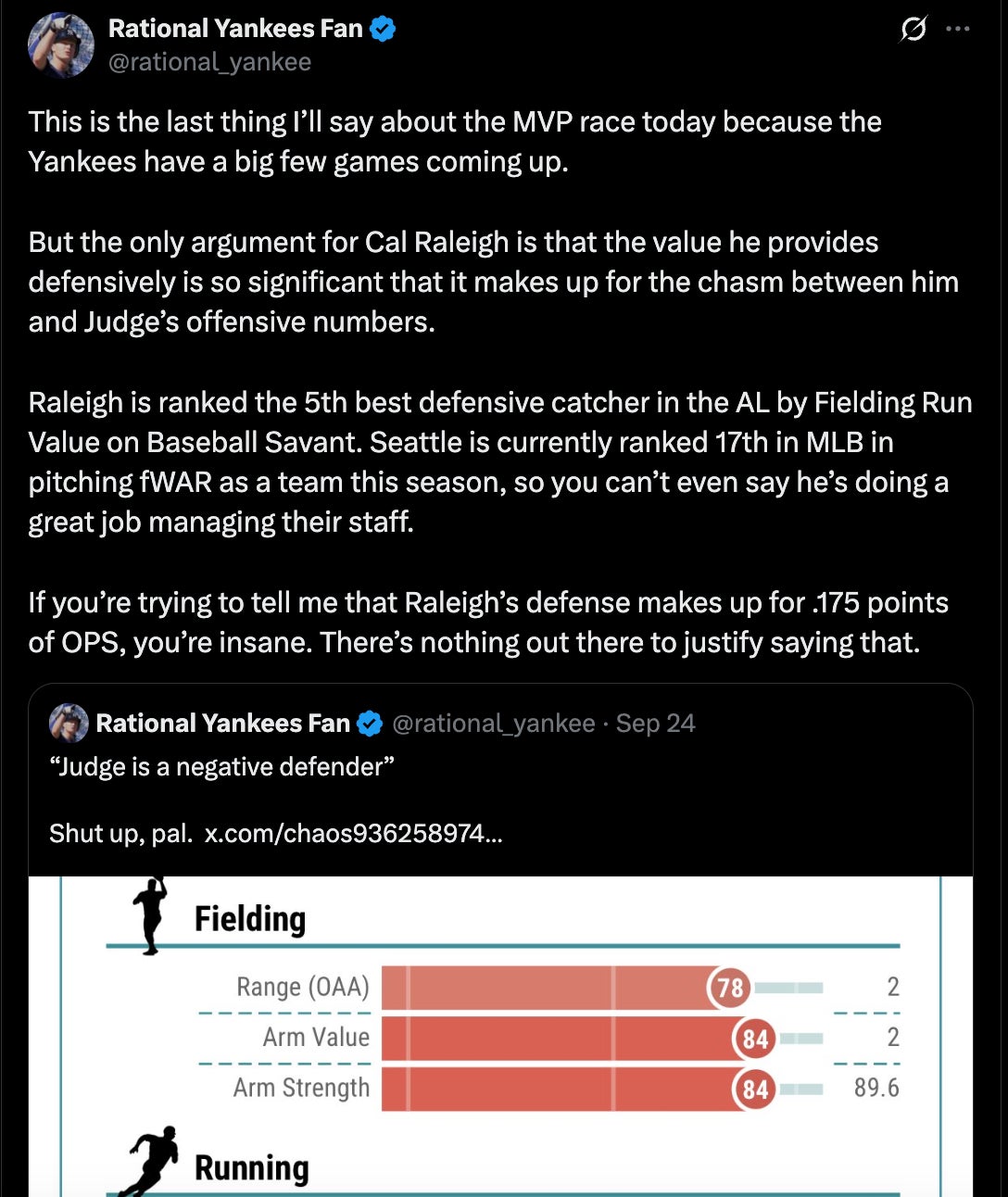 Outside of the home runs, the only thing people seem to care about is that Raleigh catches. The thing is, he's not even that good of a catcher this year. In 2024 Raleigh won the platinum glove, given to the league's best defender. That was LAST season, but people see that and just assume it's the same deal in 2025. It's not.