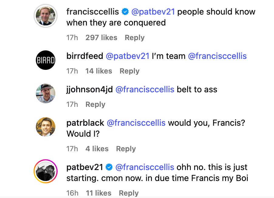 I had no plan to write a sequel blog today. It's not my style, really. But then I saw this from Pat, when the main account posted a clip of me talking to Dave about the first class bullshit where I told him that our Head of Commerce was the guy who originally suggested I be taken off the list: