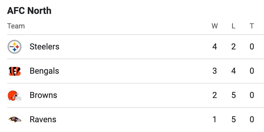 - Is this season 100% over? I'm not saying we're any good. We're not. But umm, you know who else isn't? Every single team in the AFC North. We're 2 and 5 but the Ravens are absolute trash without Lamar, the Bengals (although greatly improved with Flacco) don't have Burrow, and the Steelers have to be the worst division leader in football. All I'm saying is this can get so bad that everyone is still in contention....