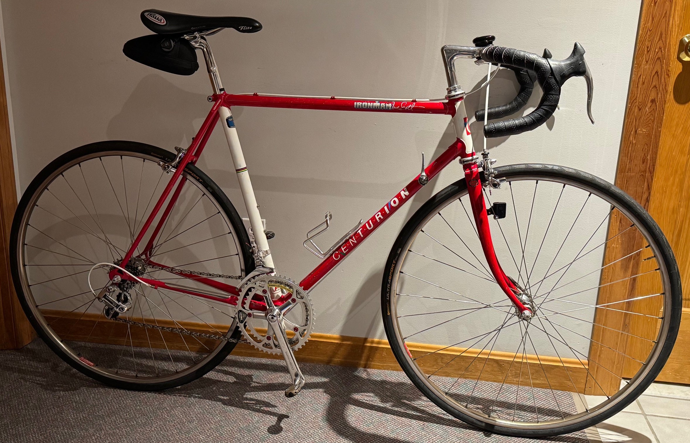 I recently began hunting for a beater, and I found one on Marketplace for $125. It's a vintage red-and-white (because red bikes are faster) 1987 Centurion Dave Scott Ironman model, the top-of-the-line Master. Made from Tange Champion #1 tubing, a double-butted, seamless chromium-molybdenum (CrMo) steel alloy, the tubing manufacturer's lightest pipes had a rider weight limit of 175 pounds. But the word was that as long as you were under 200, they were okay to ride; bigger guys could twist 'em up. The frame was fabricated in a high-end welding shop in Japan, where many great bikes were built.