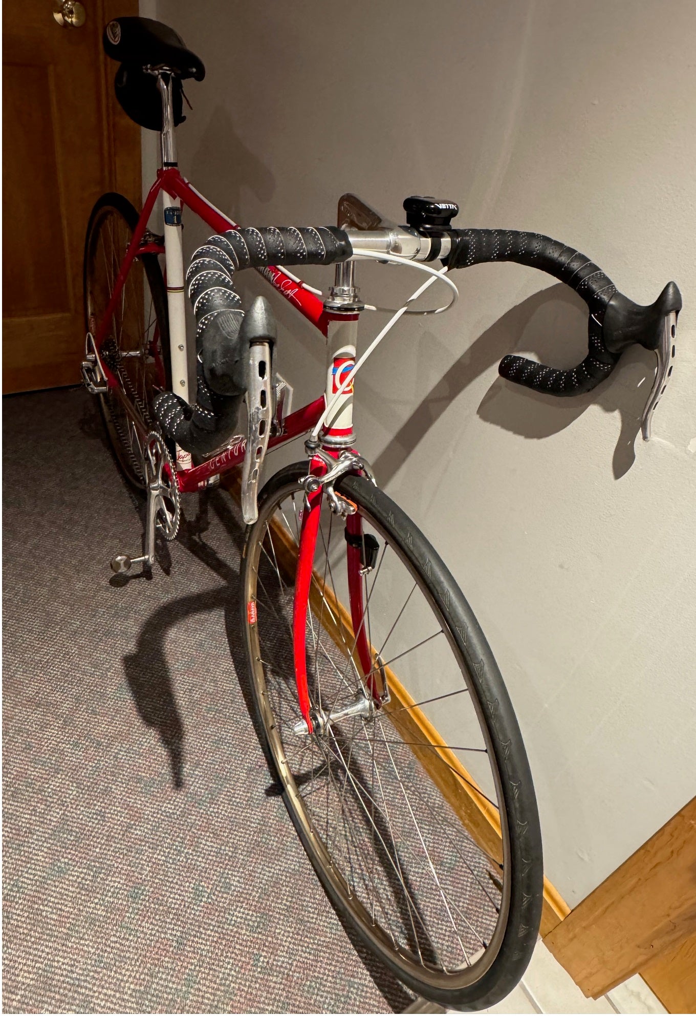 I upgraded a few things, mostly with stuff I already had. I installed a used Dura Ace 6-speed freewheel (13-19) on the rear wheel, along with some new sealed-bearing derailleur pulleys that I had lying around. It came with a brand new chain with no chain stretch whatsoever. I installed a shiny Aero seatpost and a used Selle Italia Flite saddle, both of which I picked up on eBay for cheap. I removed the narrow '80s handlebar (15" c-c) and replaced it with a wider one (16 1/2" c-c) that I had been hanging in my basement forever. Then, I wrapped it with some black perforated padded bar tape for that Ferrari-like look.