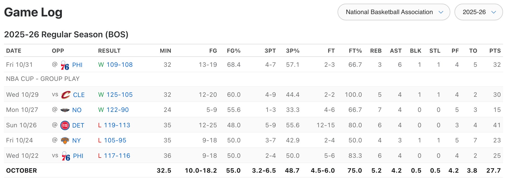 Consistency. Efficiency. Leading by example. Again, outside of the TOs, I'm not sure you could have asked for a better start to Jaylen's season. And even when the 3PT efficiency comes back to normal, because let's face it, he's not going to shoot 48.7% on high volume all year, that's not even really the point. Just look at how much better his 3PA looks compared to last year. He looks healthy, he's getting great lift on his jumper, and his shot diet has been a perfect balance between rim pressure, midrange, and 3s.