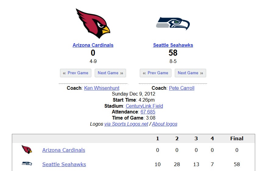 I swear I heard on the broadcast that this was the first time since the 1950s or maybe even earlier that Arizona gave up 38 first half points. Did anyone else hear that? Well, I have to stand up for Cardinals fans here. Credit where credit is due and this isn't even the first time this century they've allowed this against just the Seahawks.