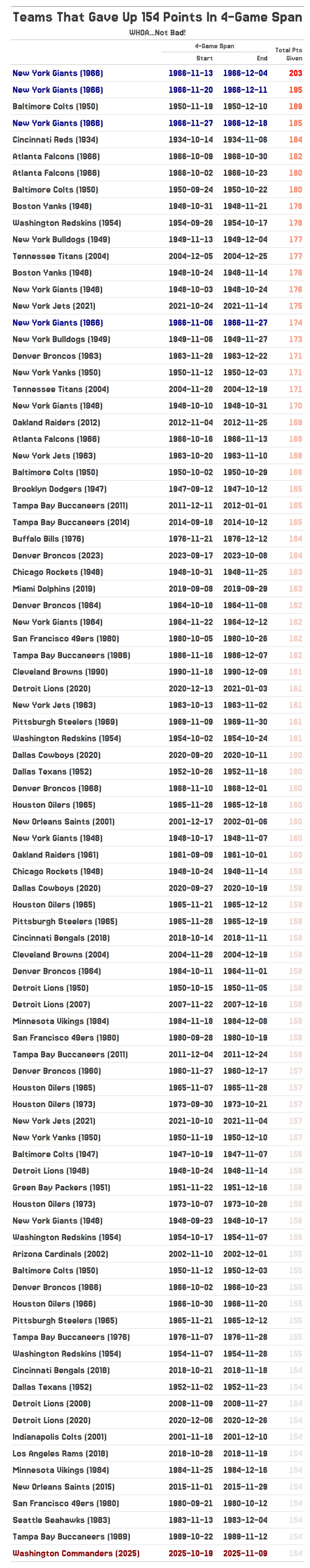 Sad Stat #2: The Washington Commanders have given up 154 points in the last four games