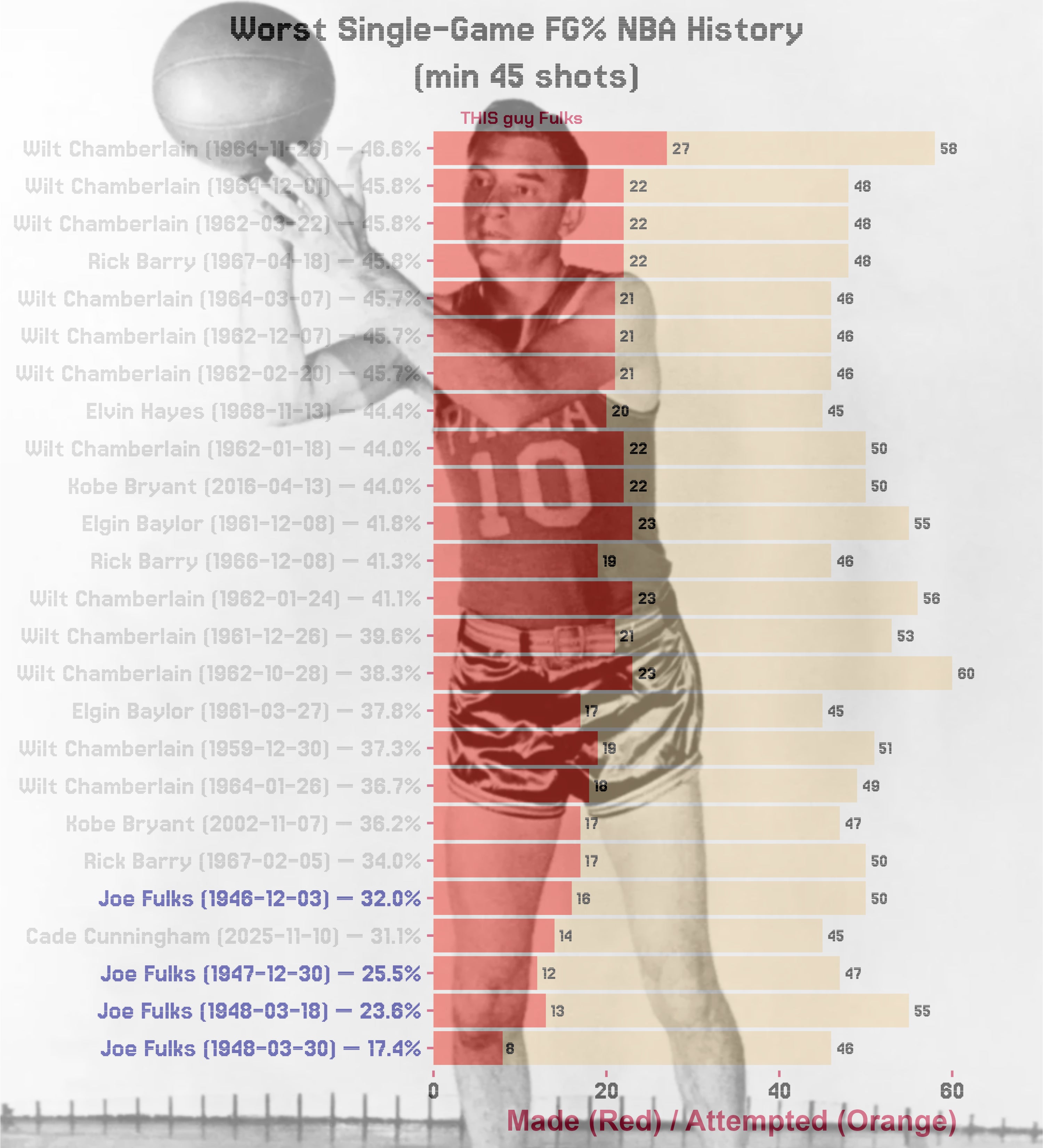 But Cade Cunningham had an interesting night the other day. He shot 45 times in a single basketball game and made just 14 of them. I went ahead and ran where that puts him on the official all time "lowest percentage on 45 or more field goal attempts" list and found this puts him in the bottom-five.